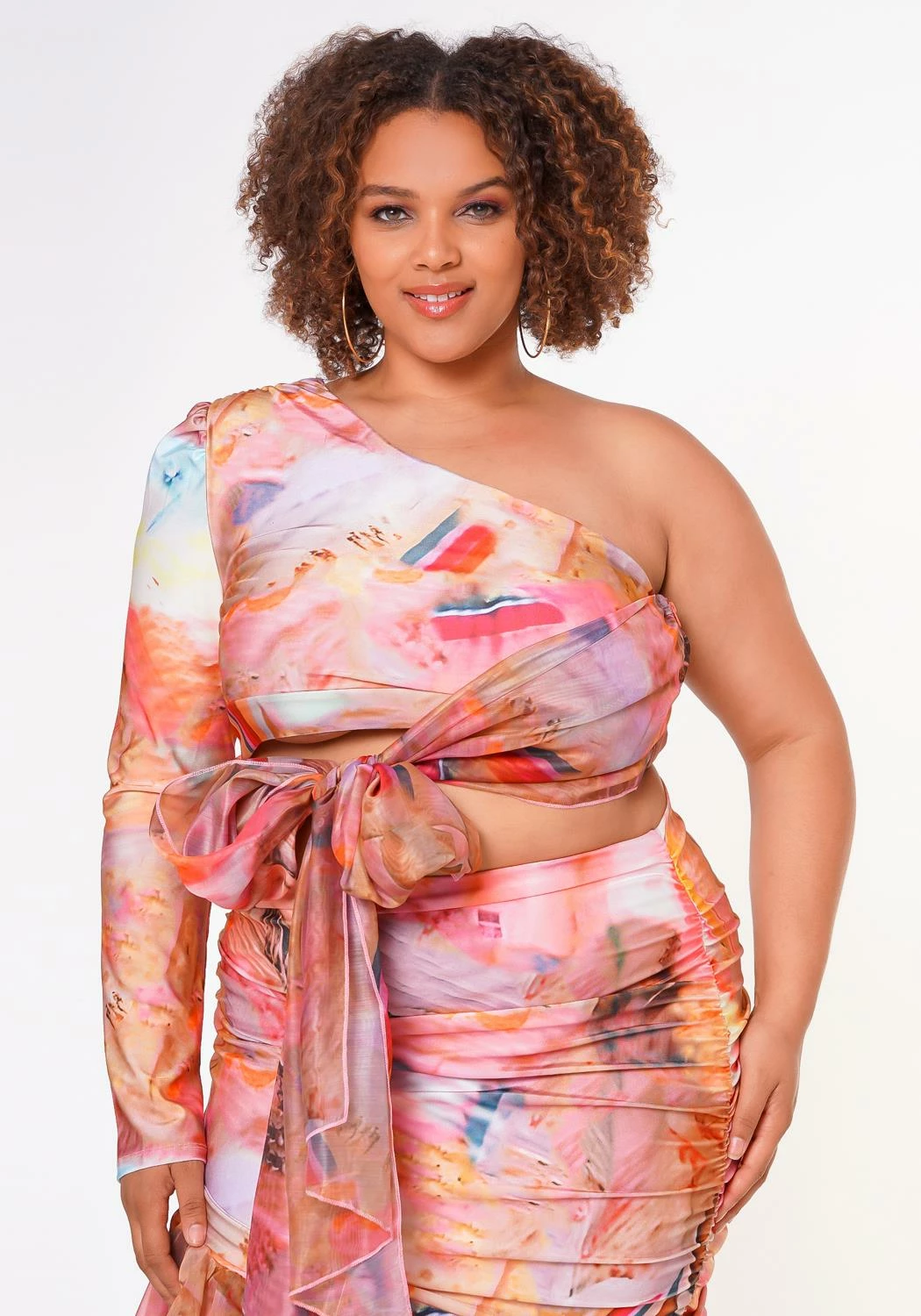 Outgoing plus size women’s crop top in multi pattern, one sleeve design with a front self-tie detail and sheen fabric. Matching skirt sold separately.