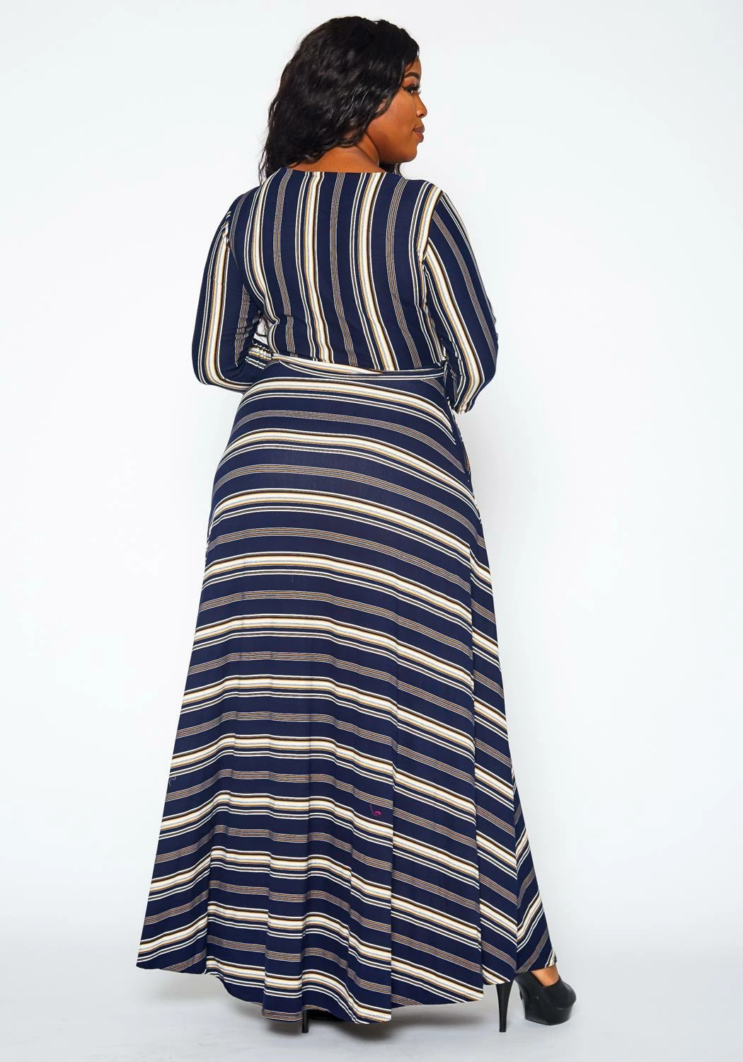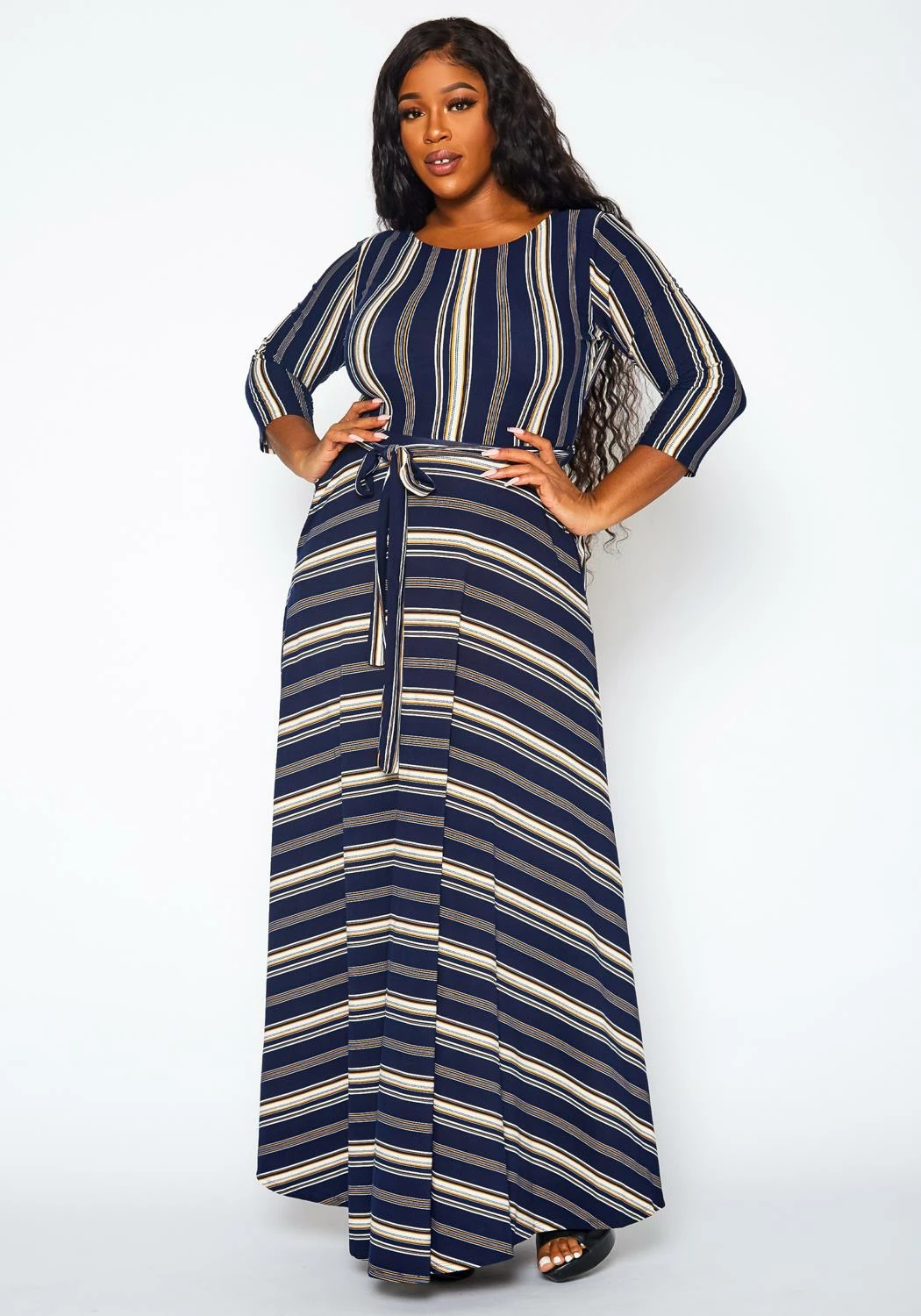 Effortless plus size women’s fit & flare maxi dress in multi striped pattern, 3/4 long sleeves, waist tie ascent and round neck style.