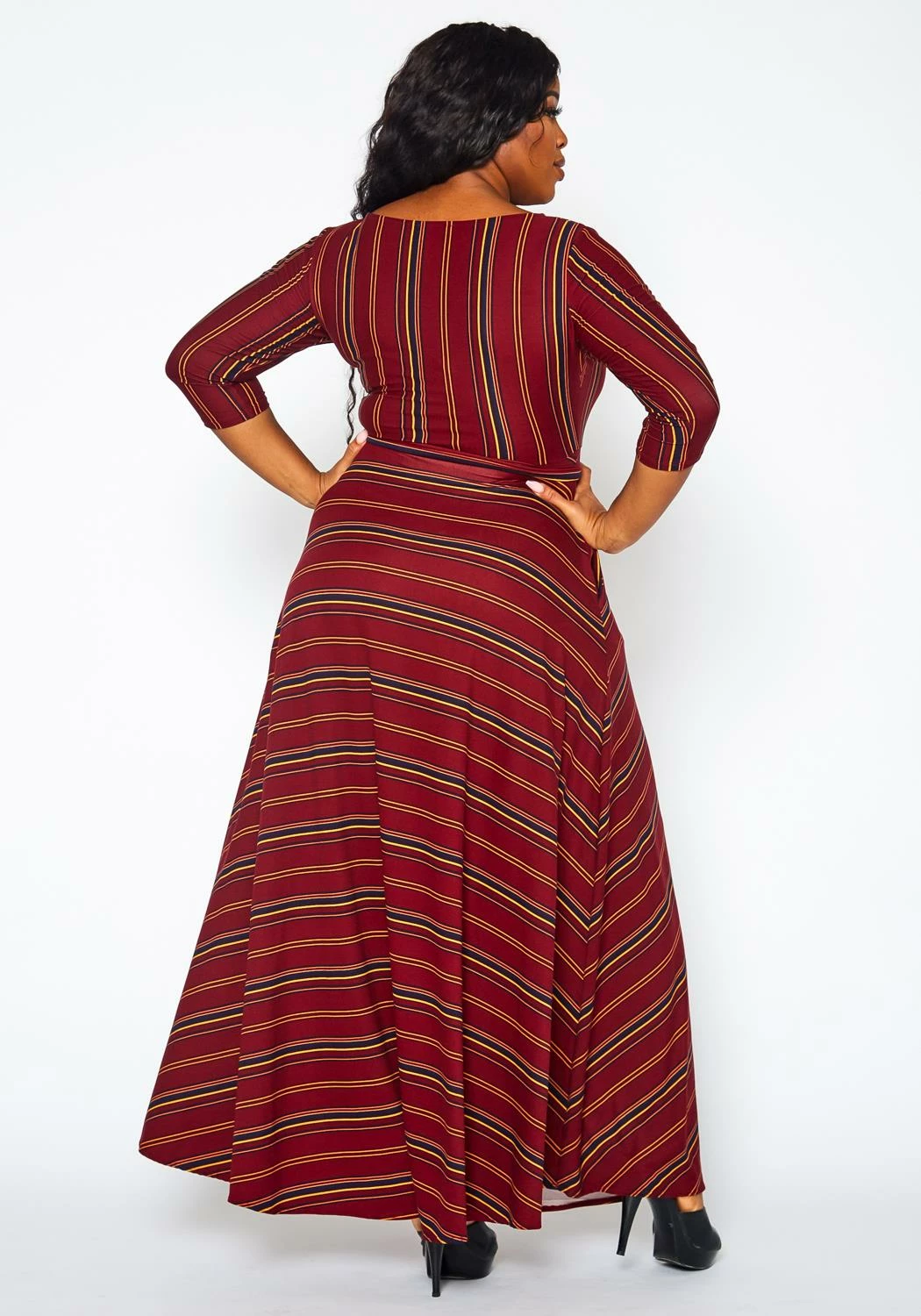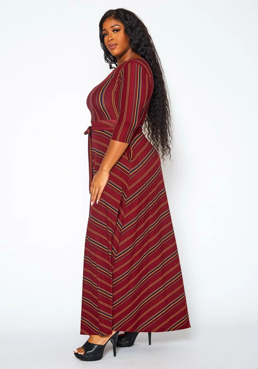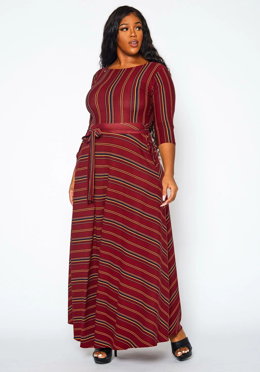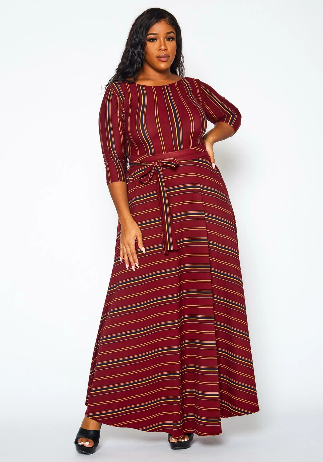 Effortless plus size women’s fit & flare maxi dress in multi striped pattern, 3/4 long sleeves, waist tie ascent and round neck style.