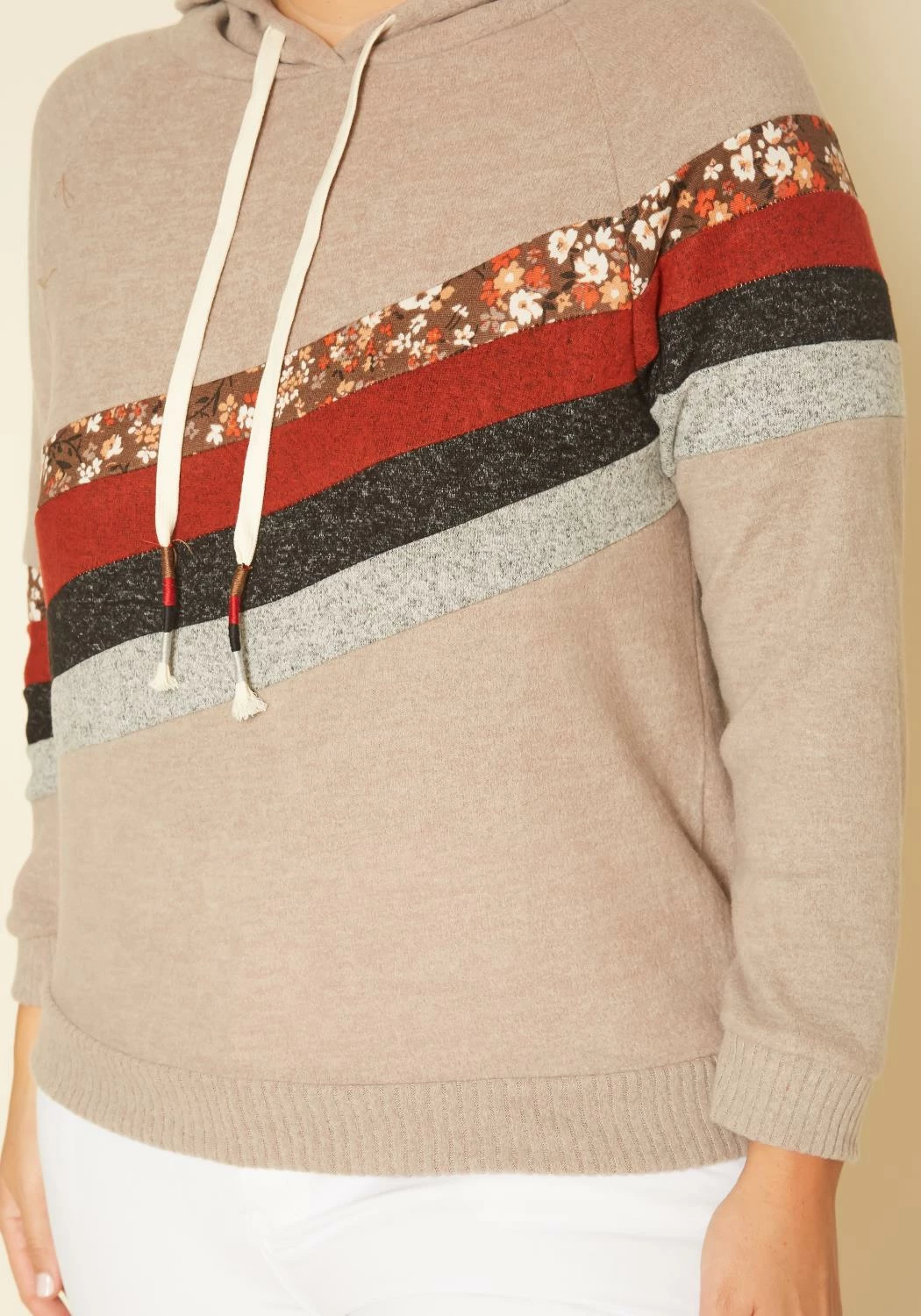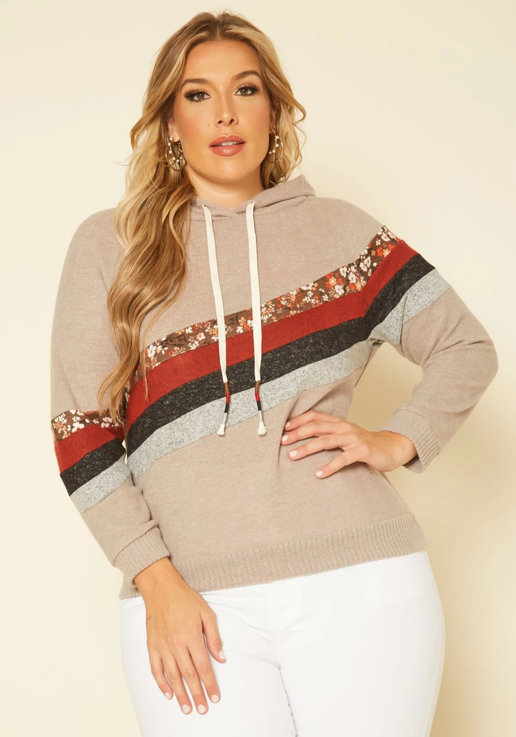 Plus size women’s lovely sweater in pullover fitting, hooded style, knit material and multi striped detail.