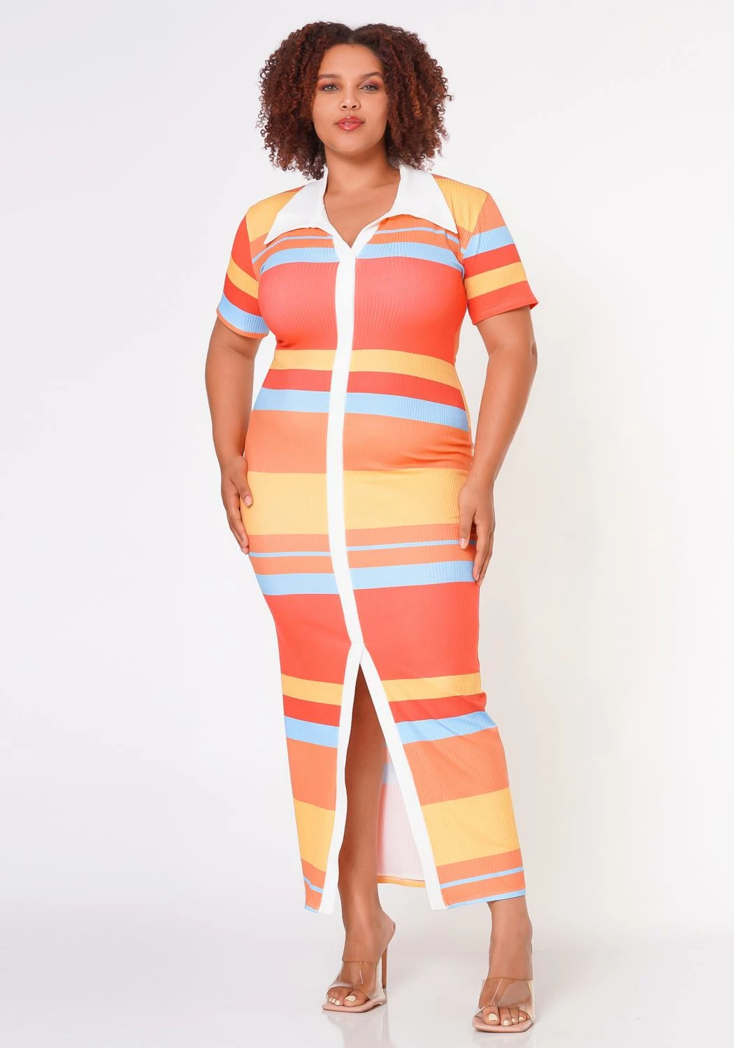 Plus size woman’s beautiful maxi dress striped print pattern featuring collar neck style, short sleeves and a slit hem detail.
