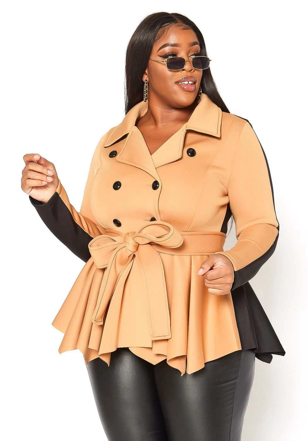 Sophisticated peplum top in notch collar style, front button hem, belted waistline and back color contrast design.