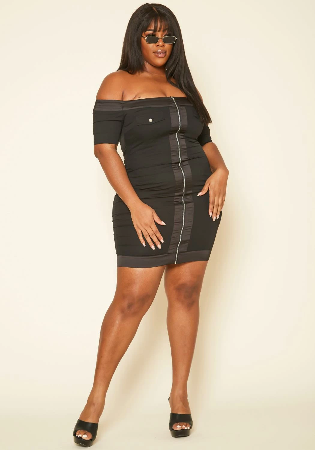 Stunning plus size women’s bodycon mini dress in off shoulder style, cuff short sleeves, zipper front and faux pocket details.
