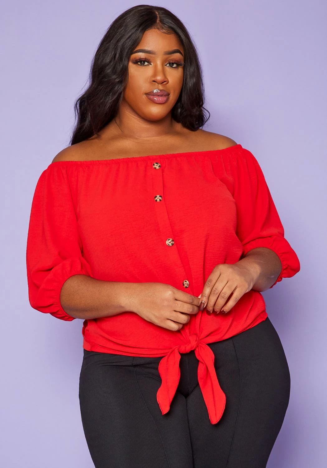 Sweet and casual plus size women’s summer top in off shoulder style, 3/4 cropped sleeves, tie front ascent and faux button details.