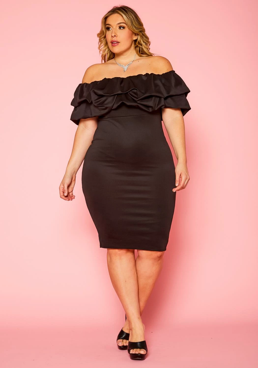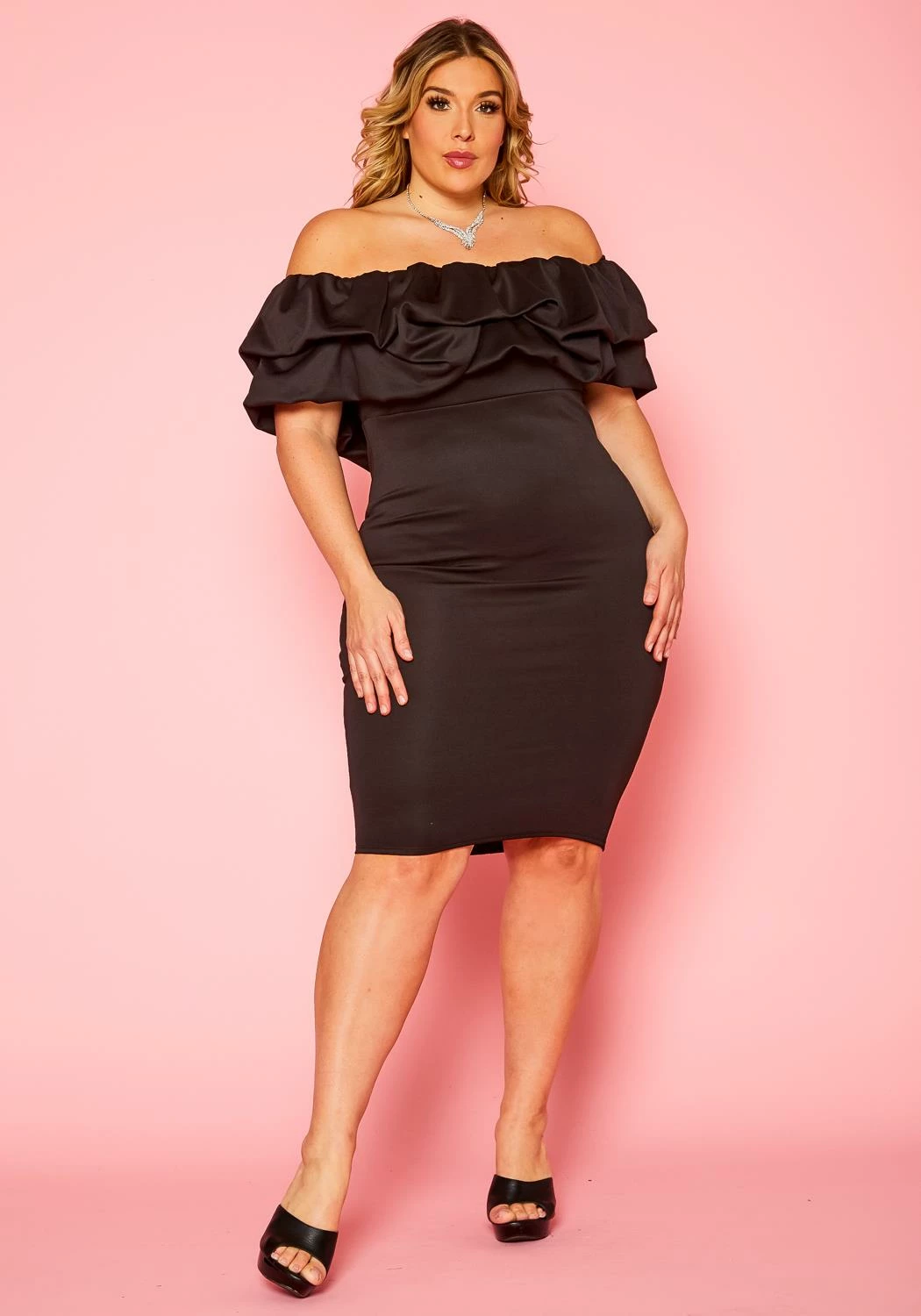 Lovely plus size women’s cocktail dress with off shoulder ruffle hem design and bodycon fitting.