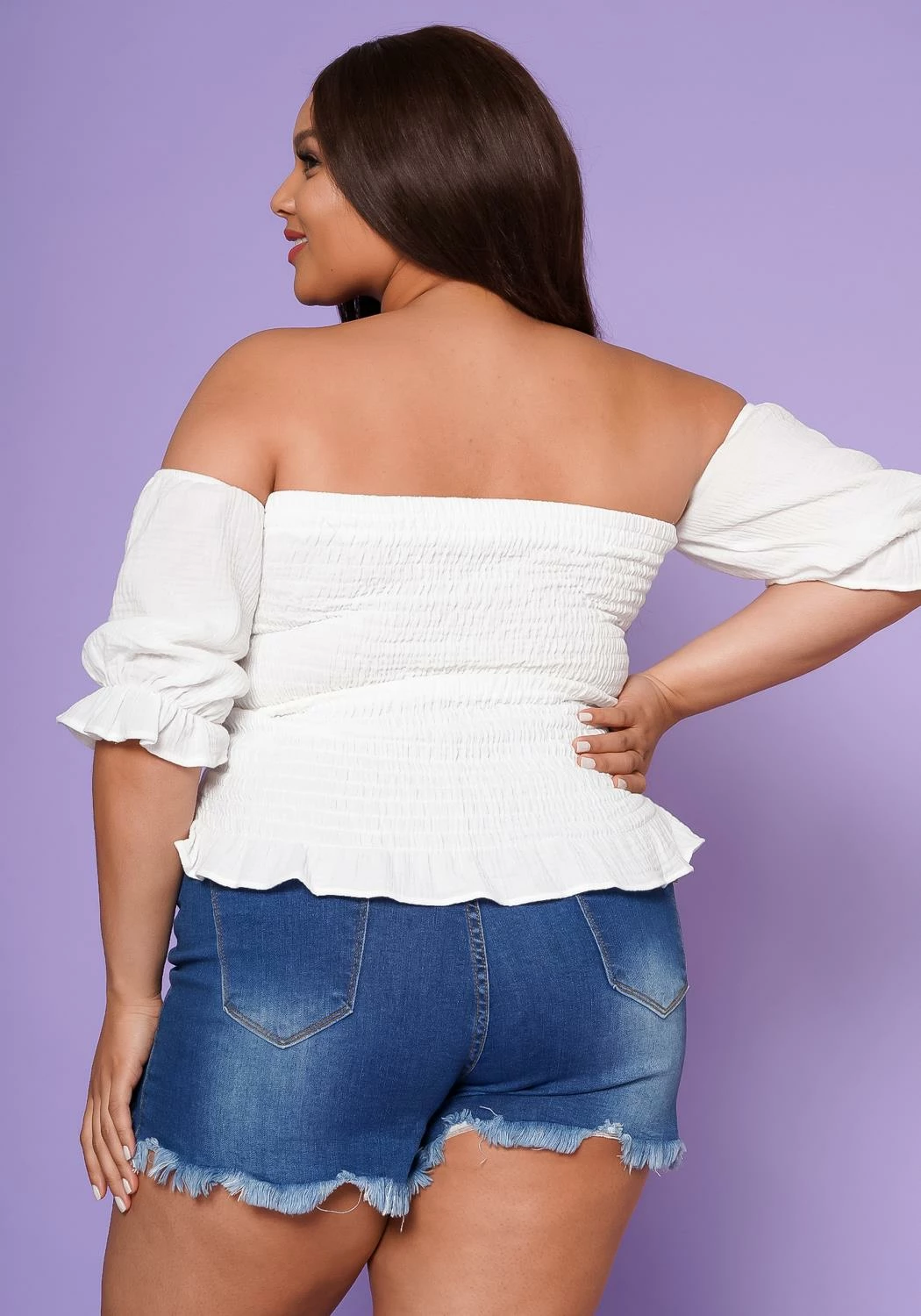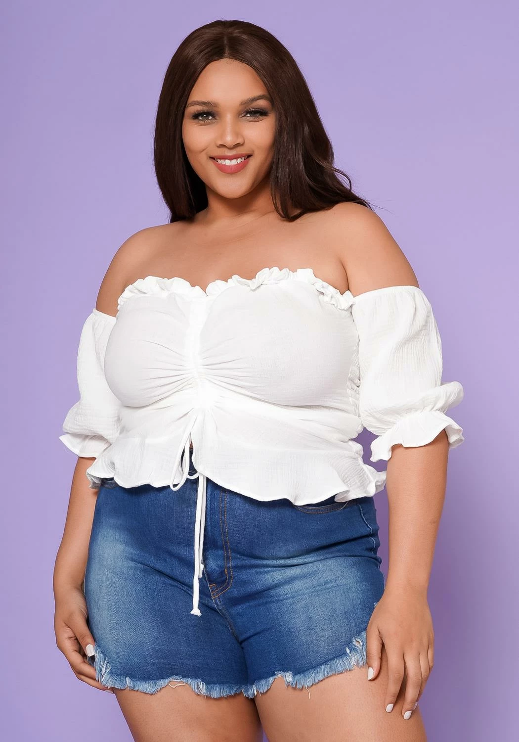 Gorgeous plus size women’s top in off shoulder style, short cuff sleeves, front drawstring hem and ruffle trim detail. This top is perfect for the warm summer events!
