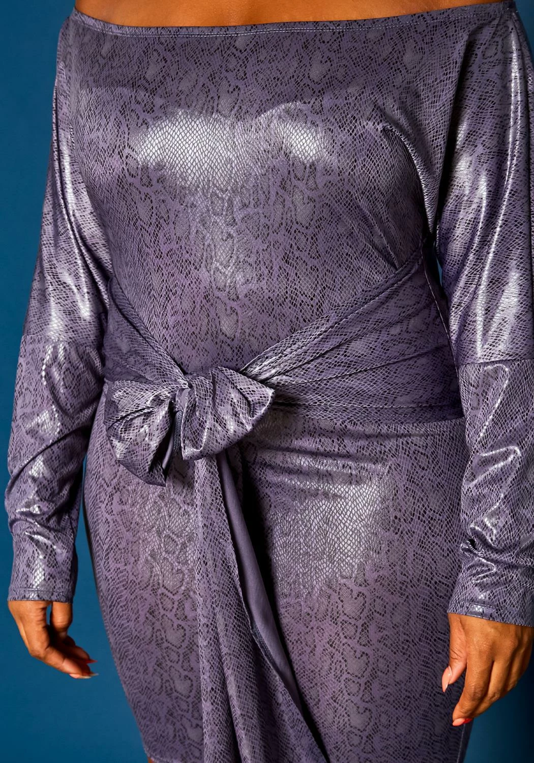 Girls night out bodycon mini dress in off shoulder style, snack pattern, dolman long sleeves and waist tie hem.