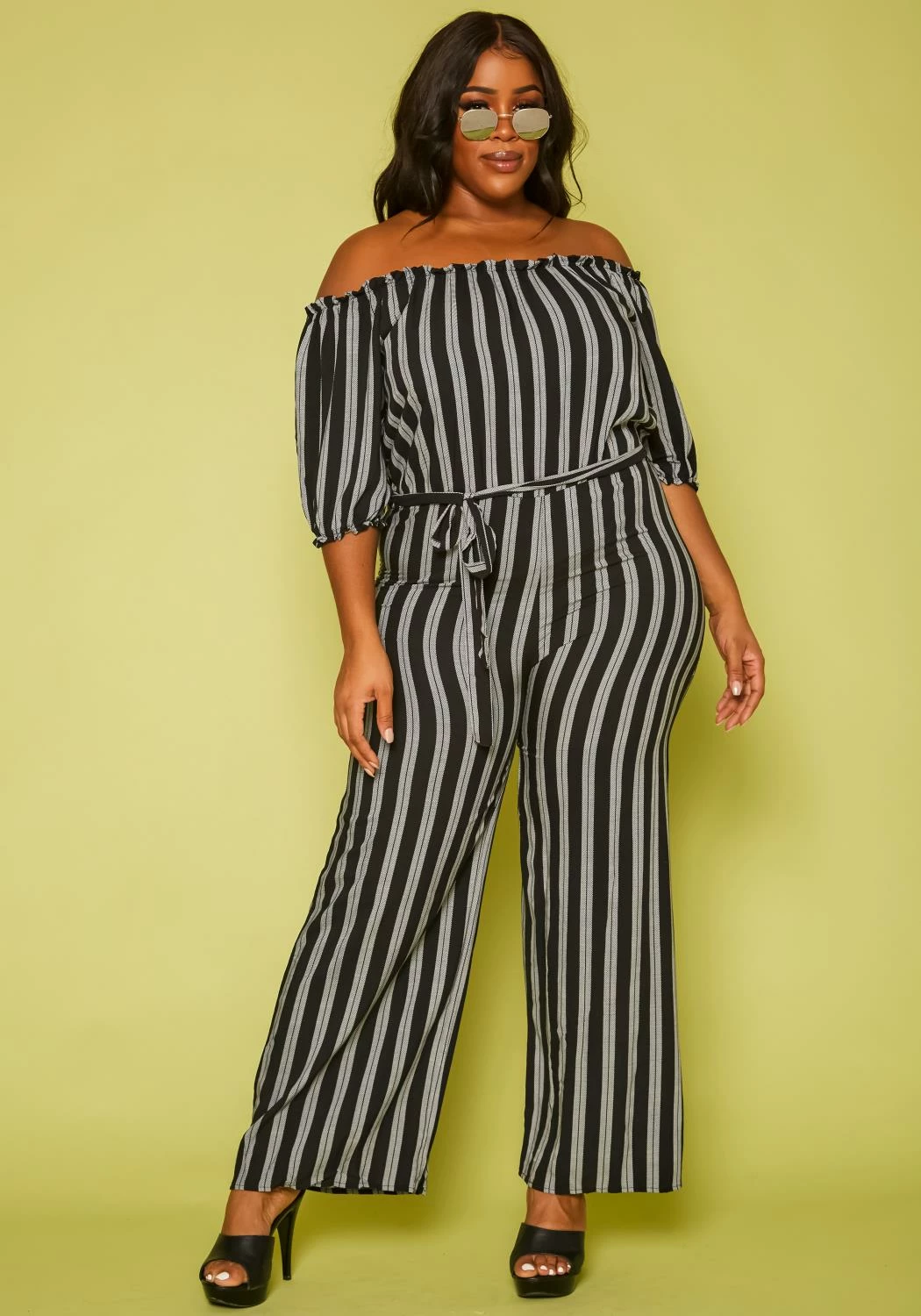 Plus size women’s lovely jumpsuit in striped pattern, off shoulder design, short sleeves, flare leg hem and belted waistline.