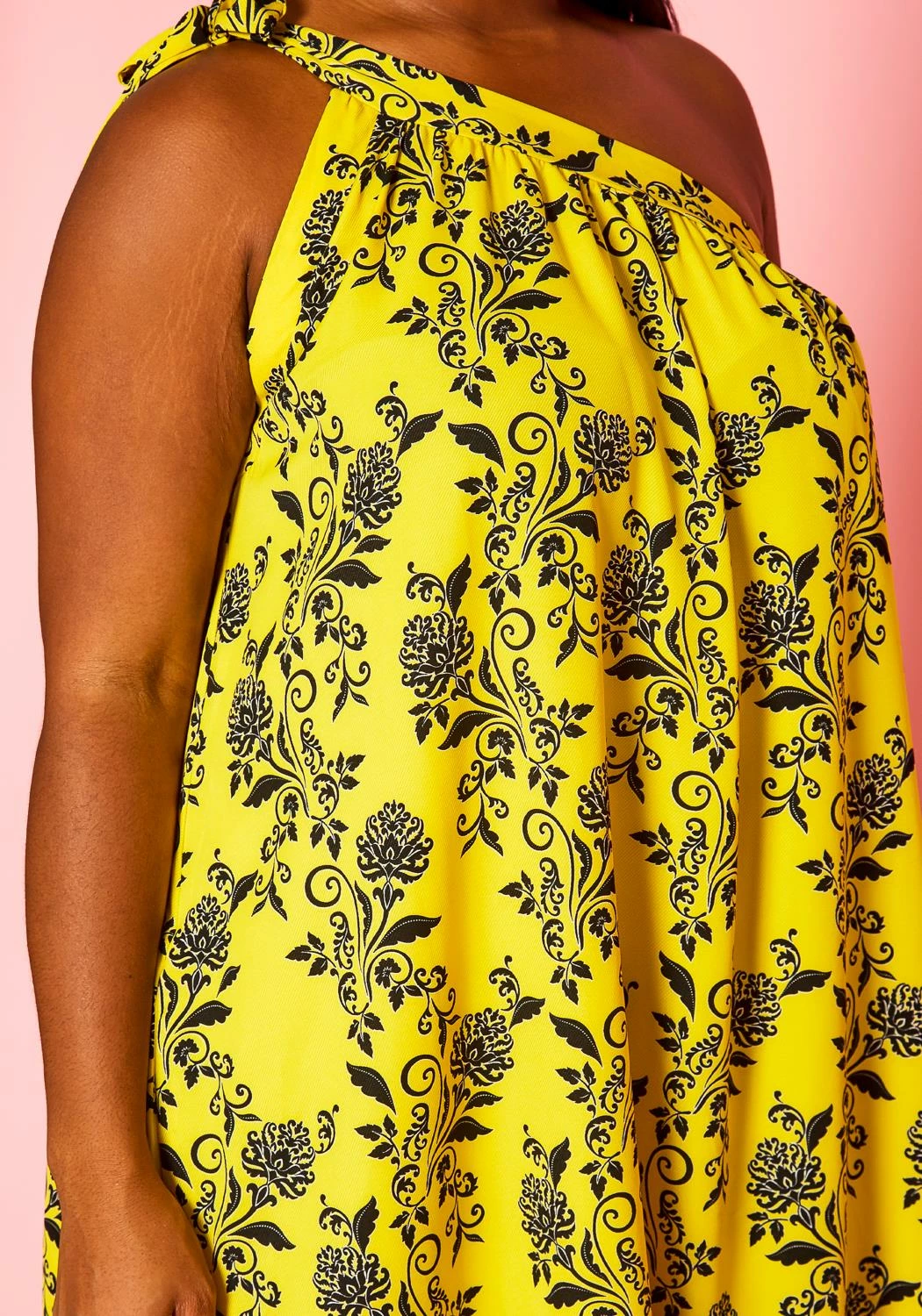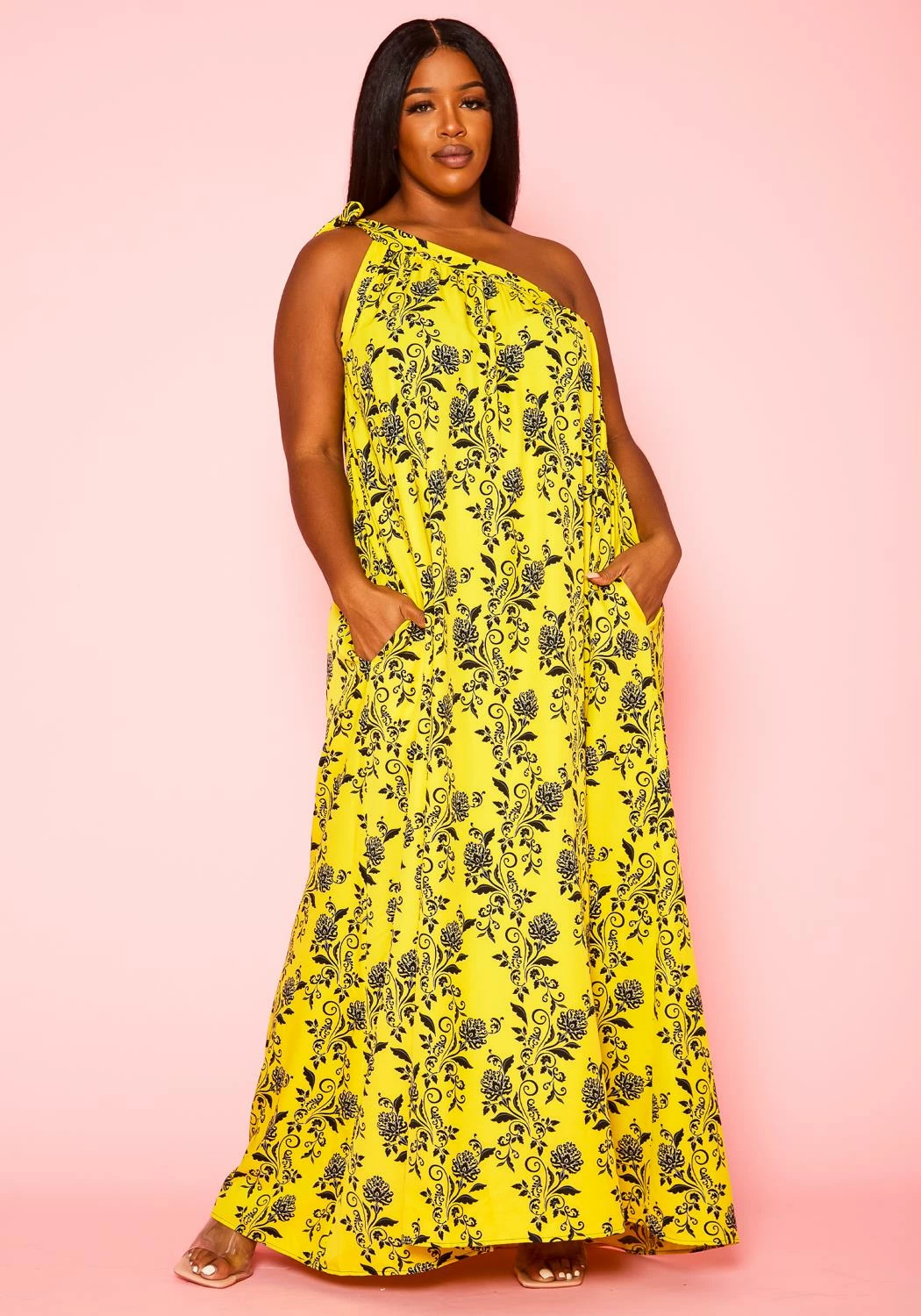 Plus size women’s maxi dress in greek style featuring a one sleeve self tie hem with side pocket detail and floral pattern.