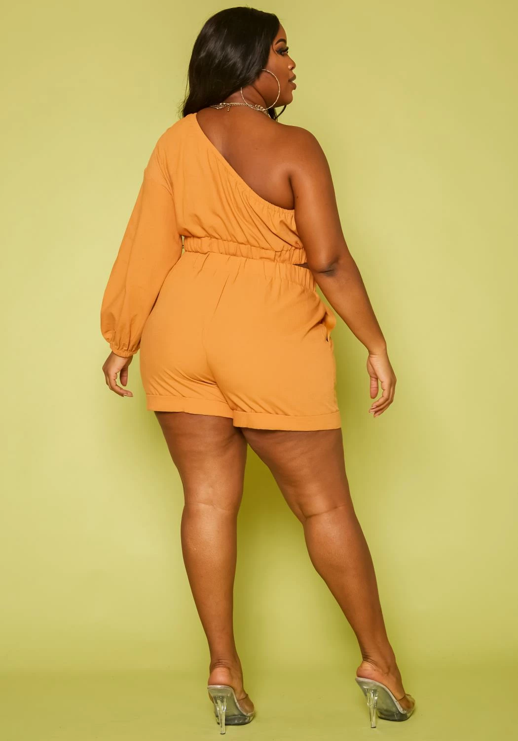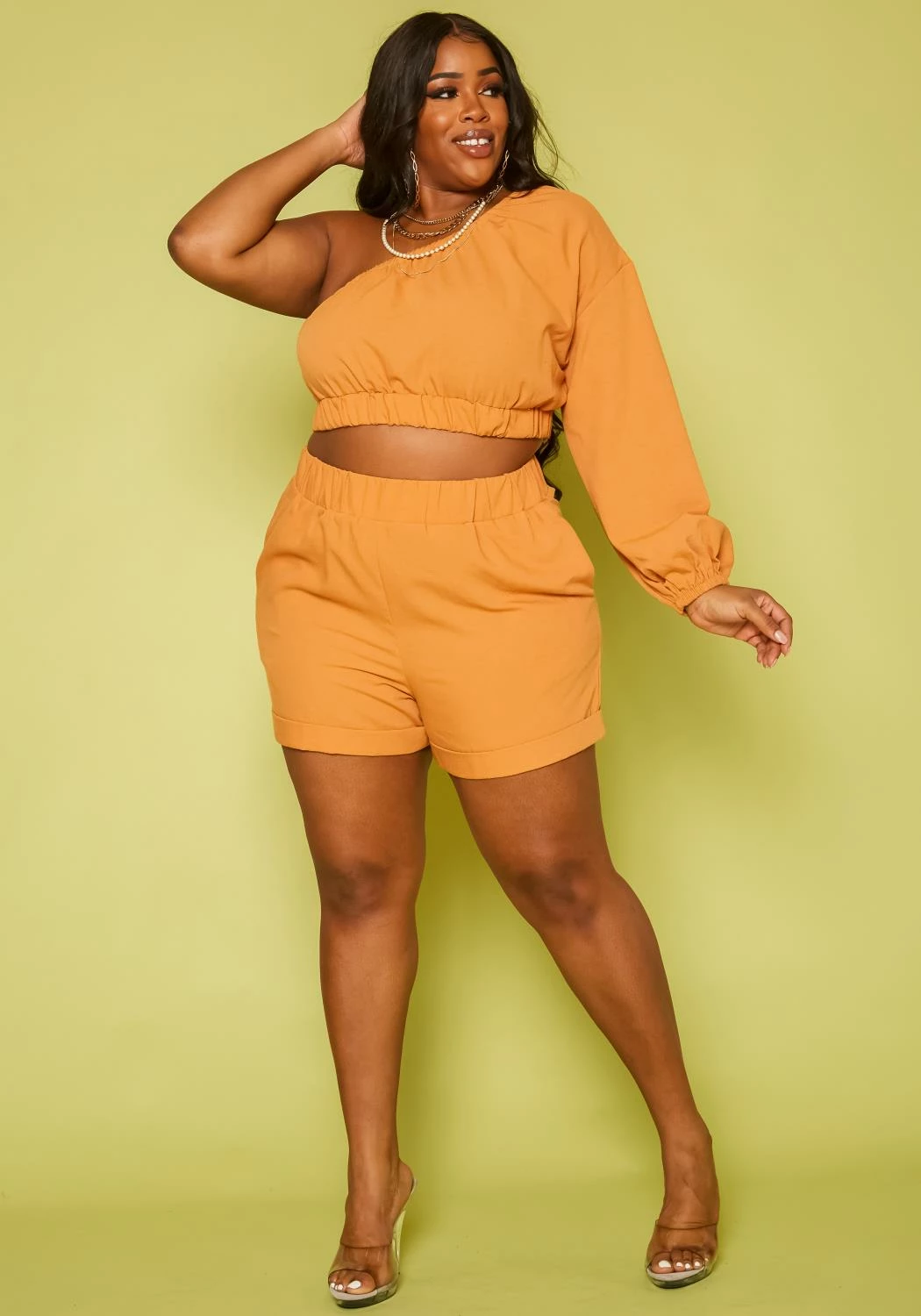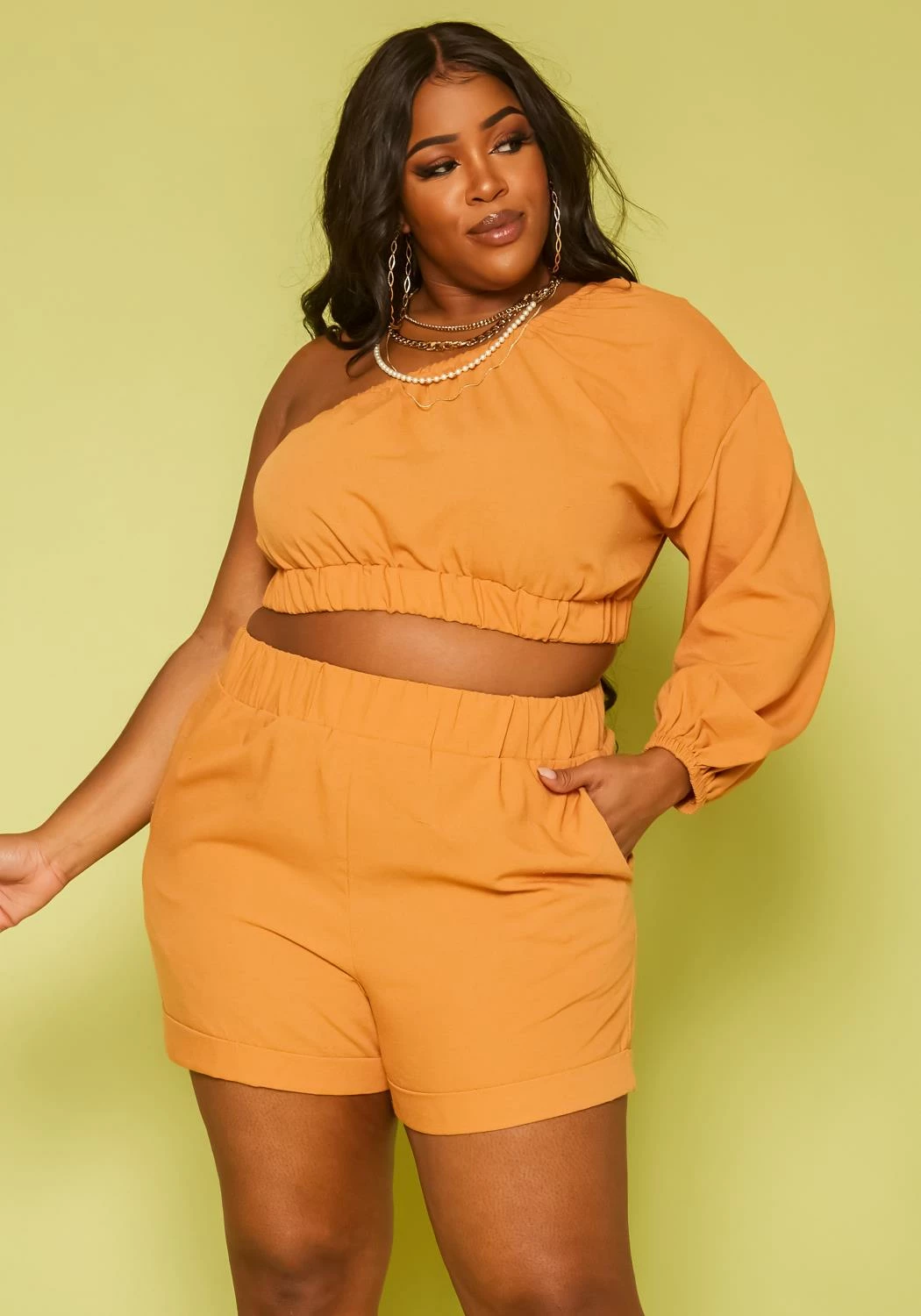 Gorgeous two piece set for plus size women which features a one sleeve crop top and matching high waist shorts.