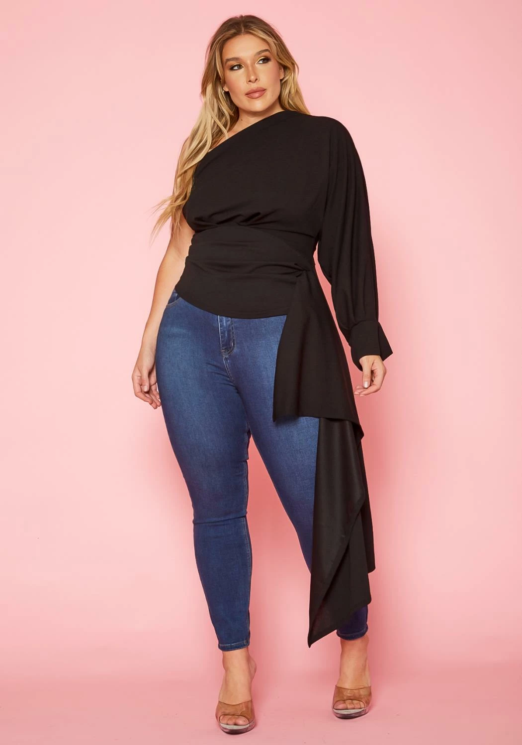 One of a kind plus size women’s blouse in one sleeve design, drape hem detail and fitted hem.