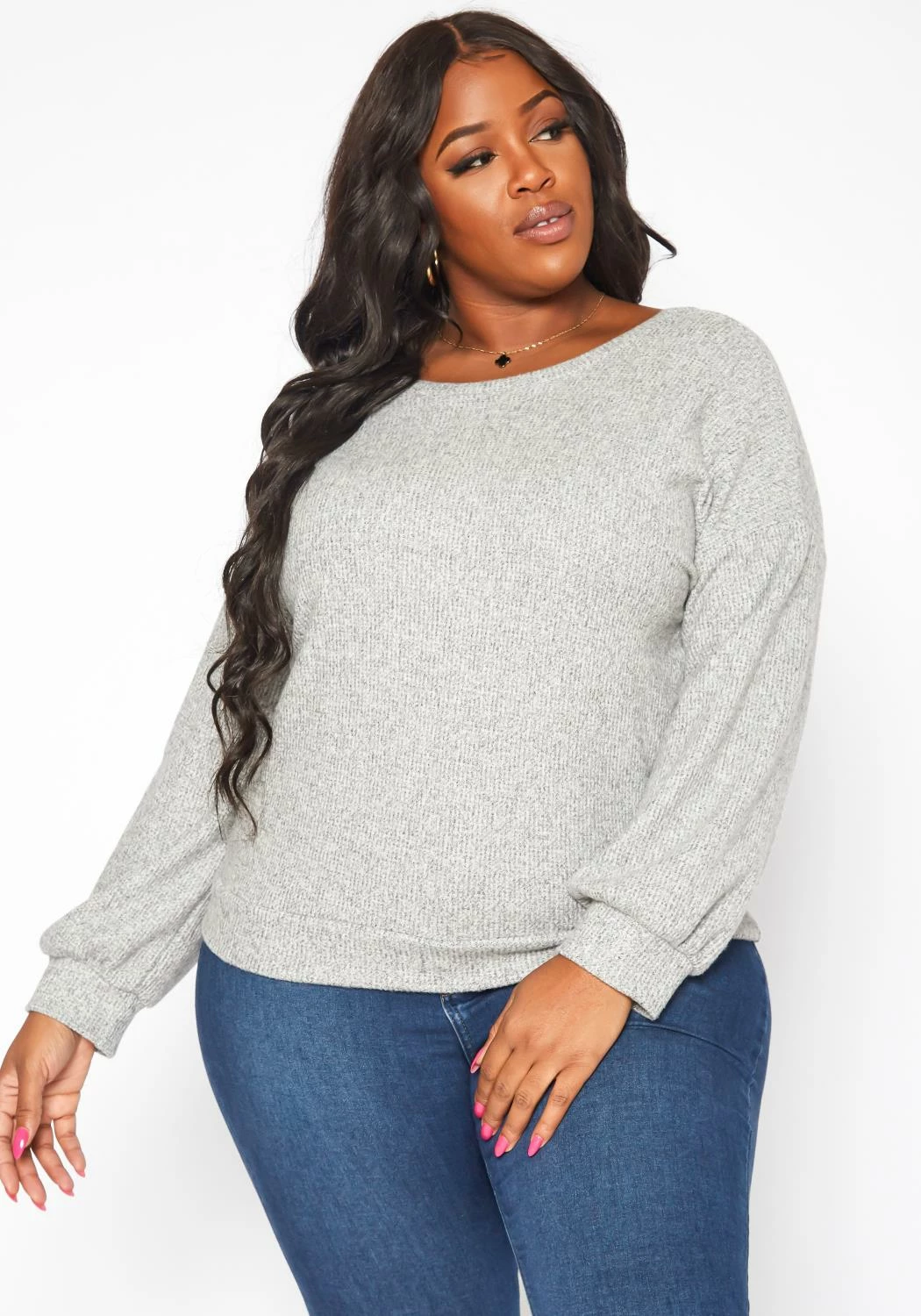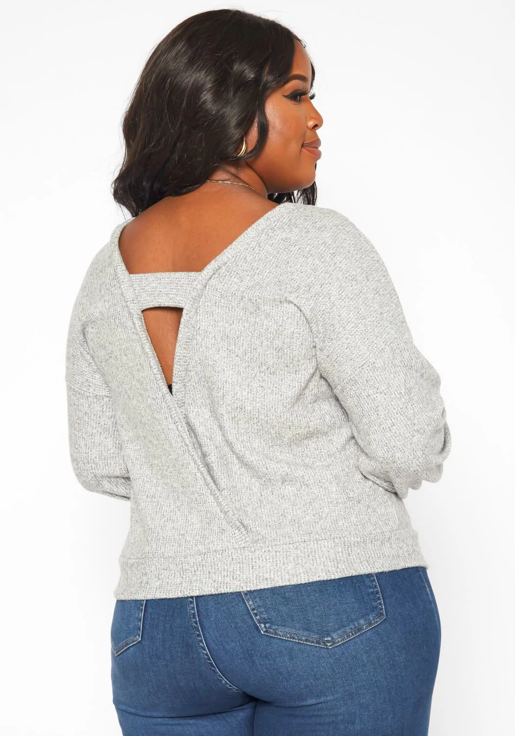 Casual plus size women’s knit sweater in ribbed knit material, crew neck style, long sleeves, fitted wrist cuffs and open back design.