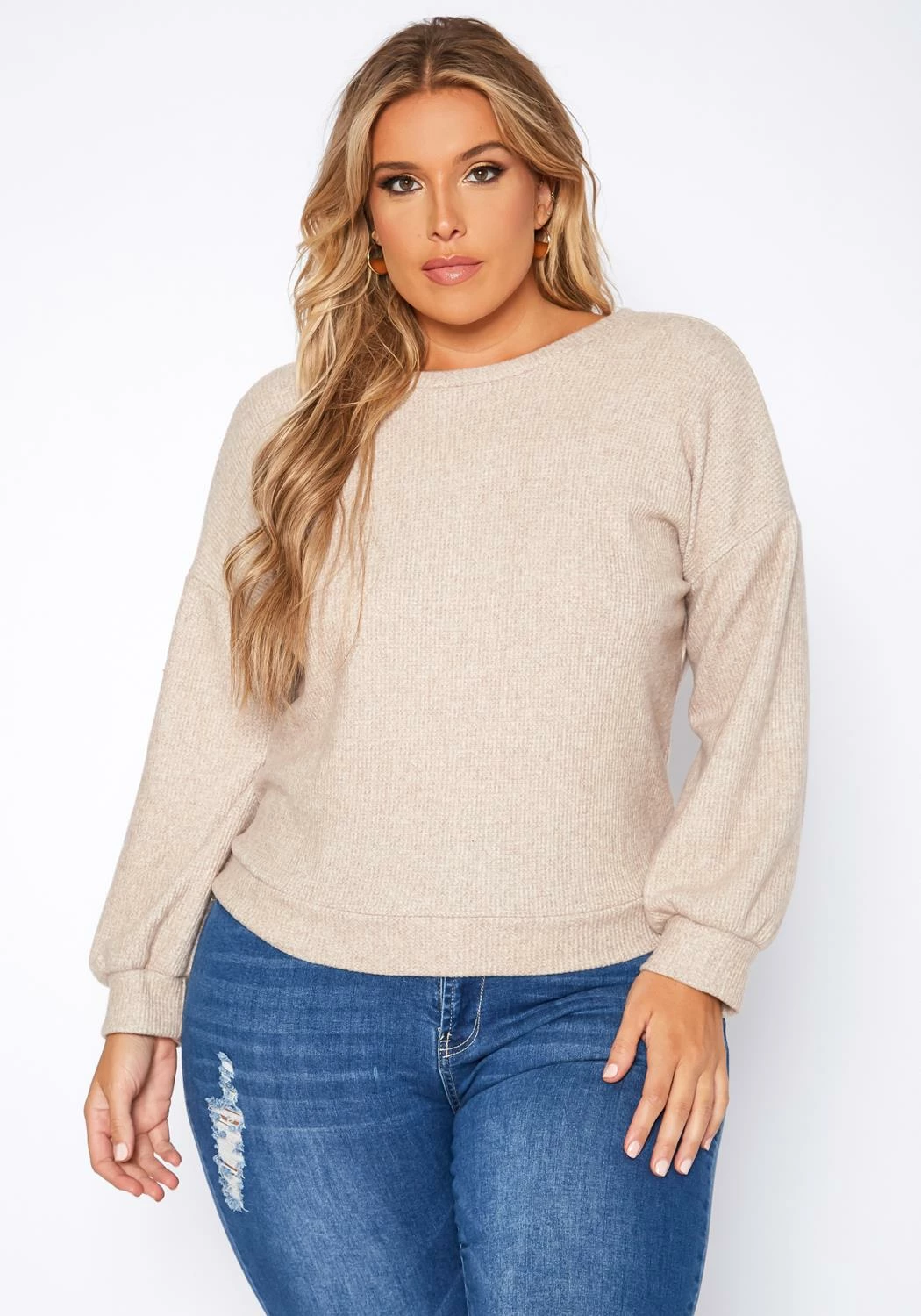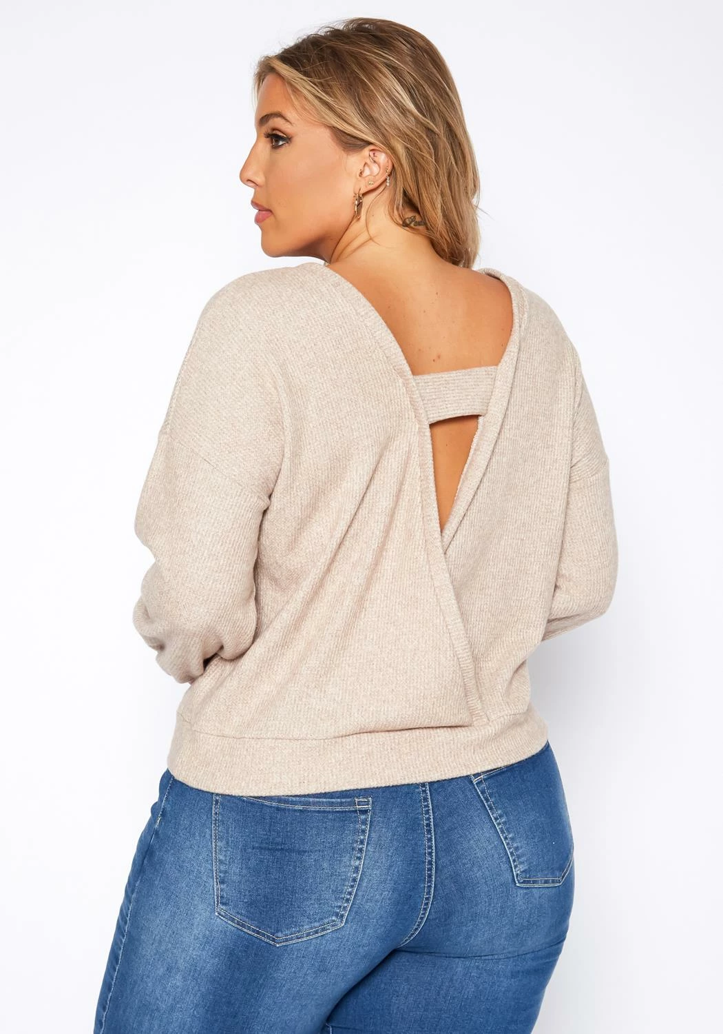 Casual plus size women’s knit sweater in ribbed knit material, crew neck style, long sleeves, fitted wrist cuffs and open back design.