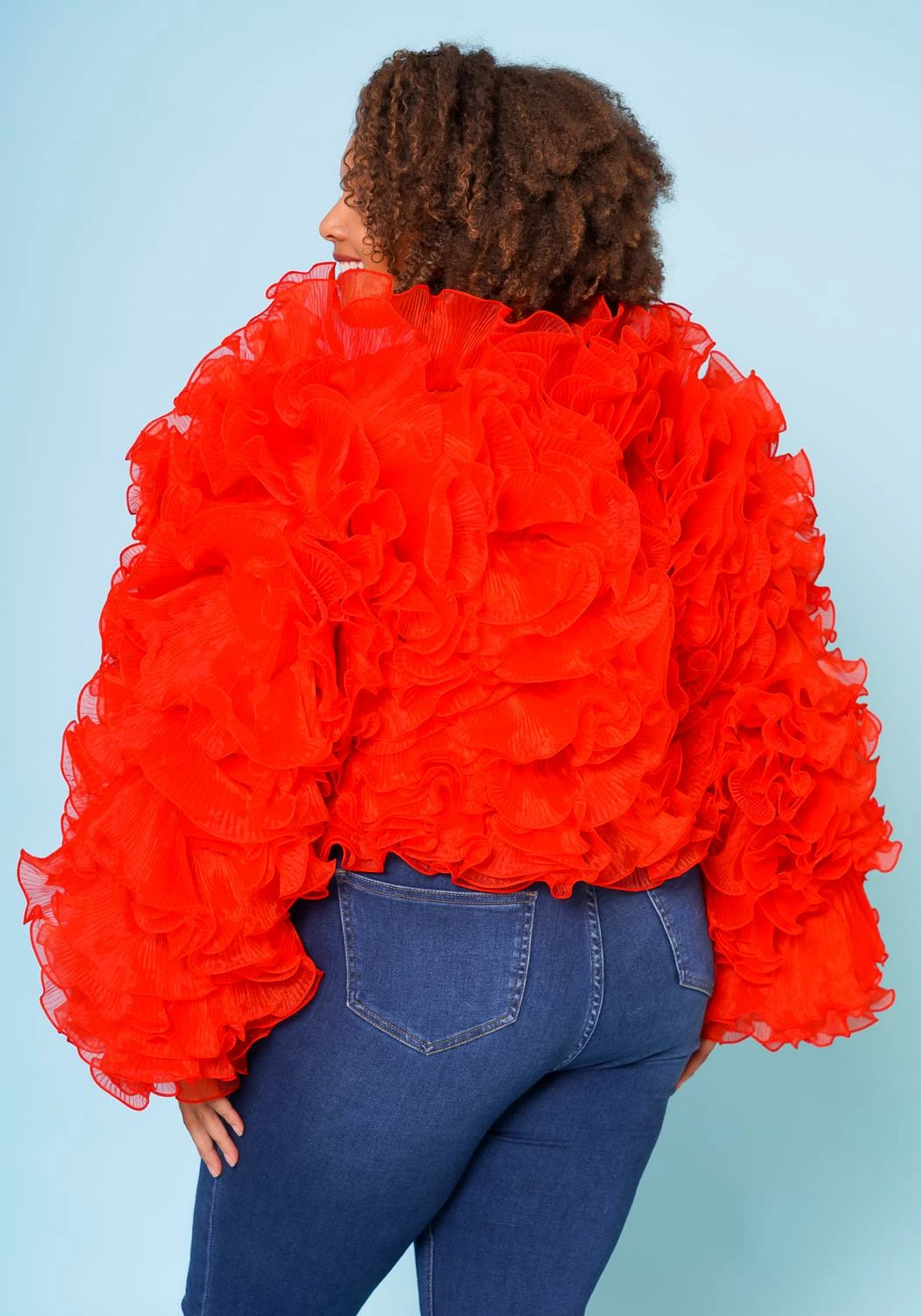 Extravagant plus size women’s tulle ruffle hem top in long sleeve design and clip front closure.
