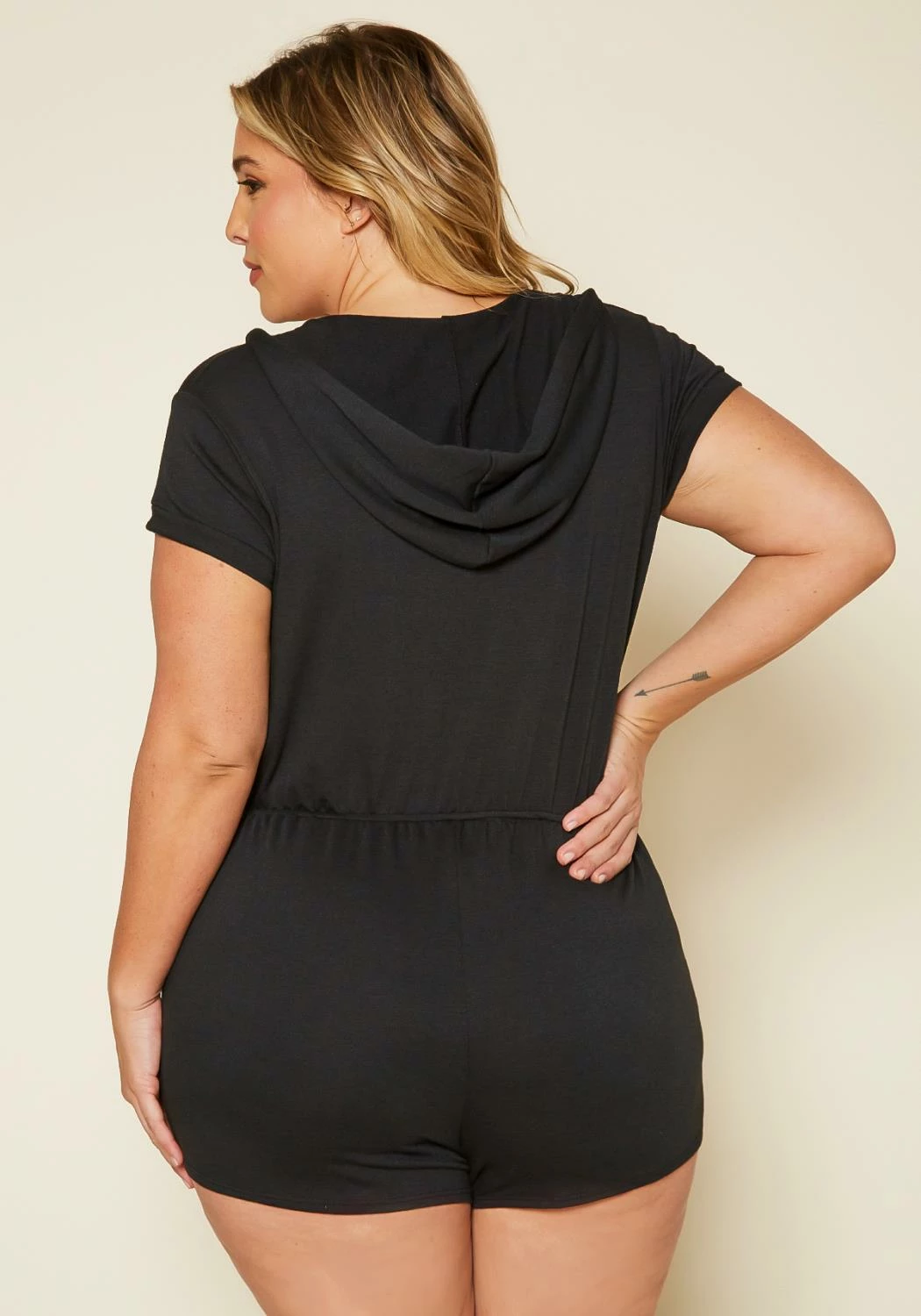 Plus size women’s romper in overlap v-neck style with drawstring detail, hooded design and elastic waistline.