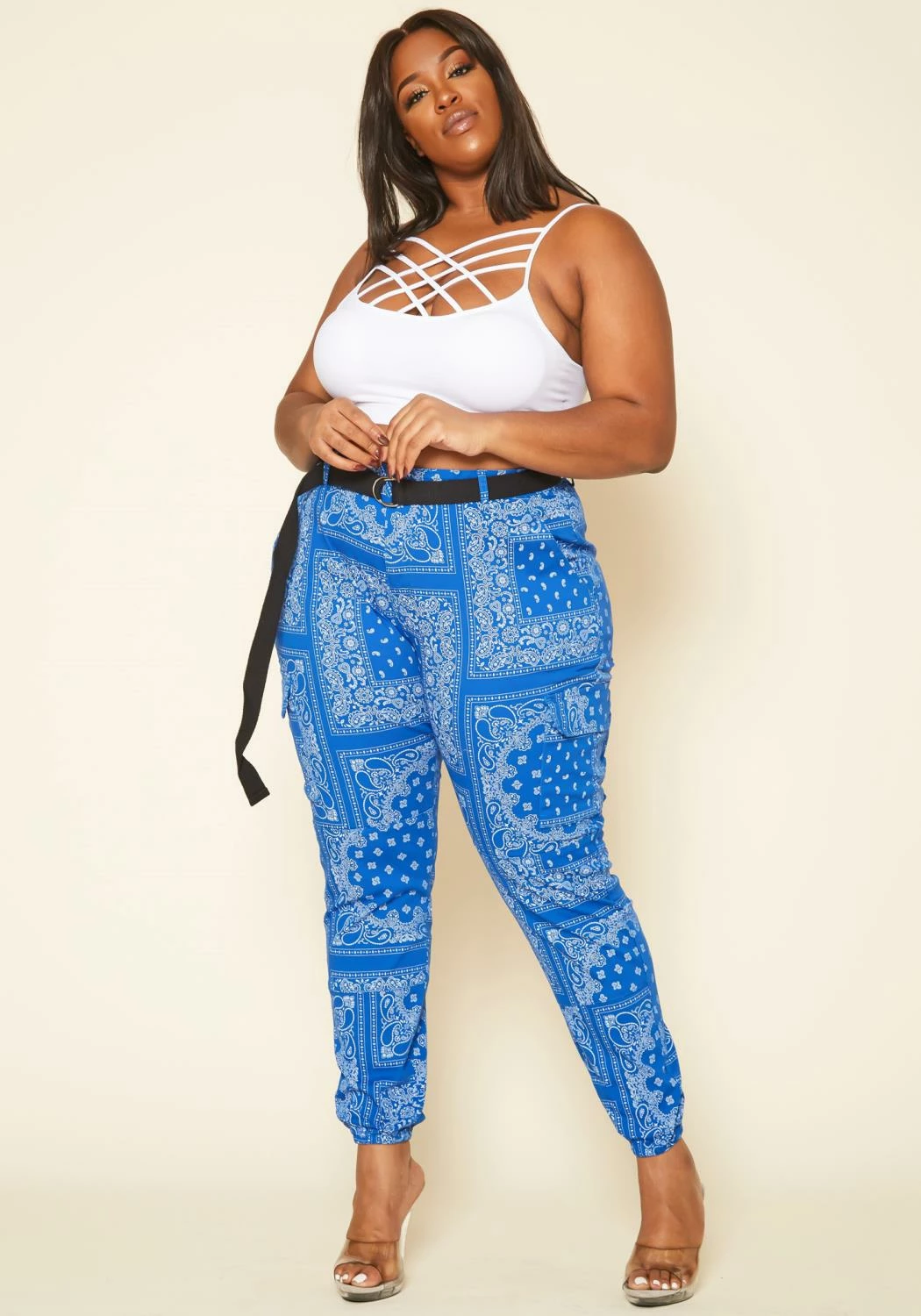 Trendy cargo pants for plus size women in paisley print, high waist style, cuffed ankle hem, D-ring waist belt and pocket details.