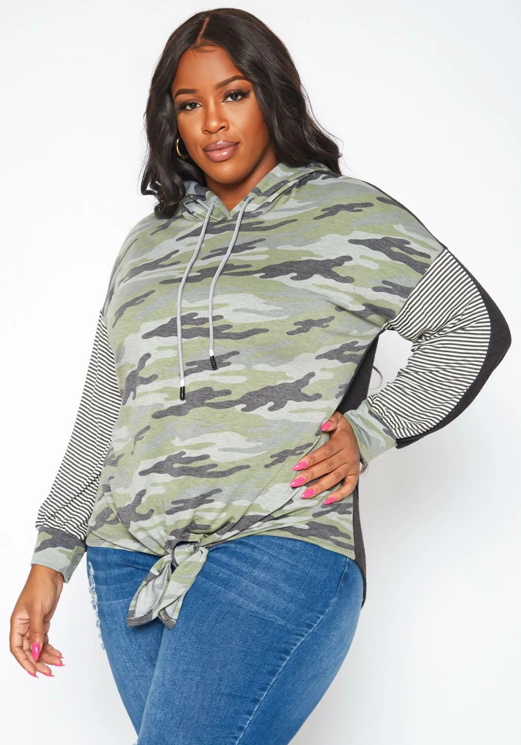 Stylish plus size women’s hooded sweater in patter splice design, hoodie drawstrings and tie front ascent.