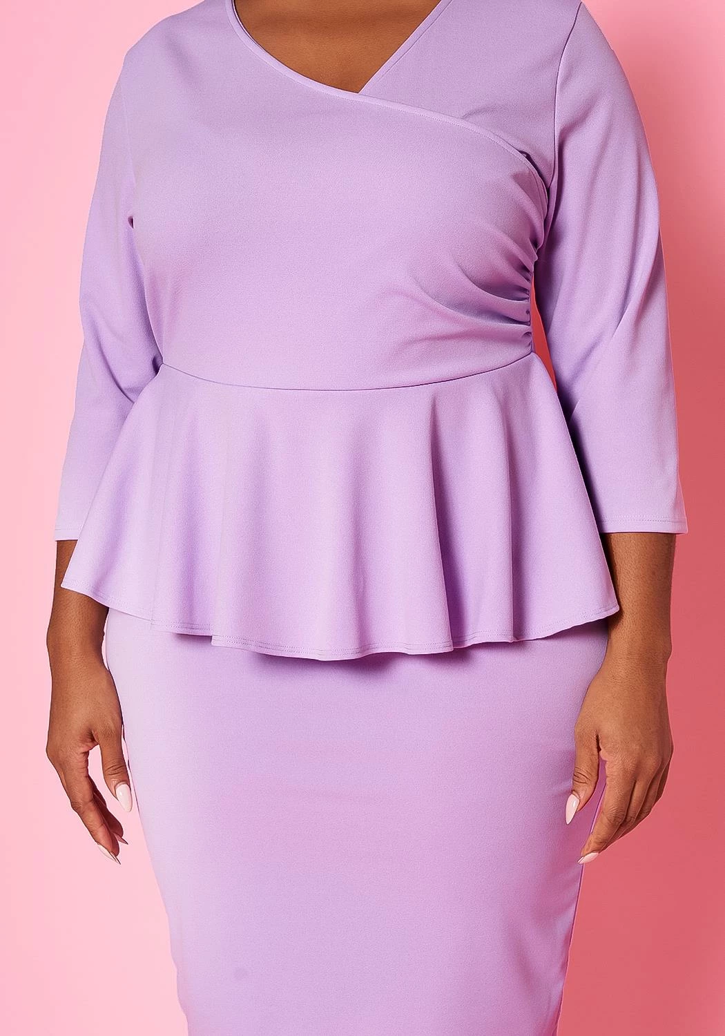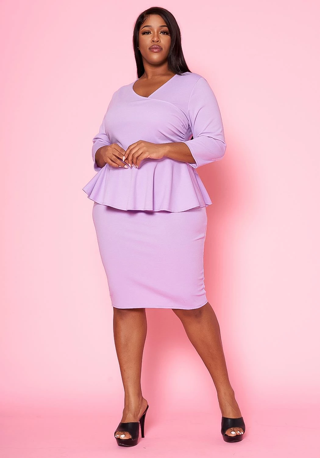 Sophisticated plus size women’s mini dress with peplum flare, v-neckline and 3/4 long sleeves.