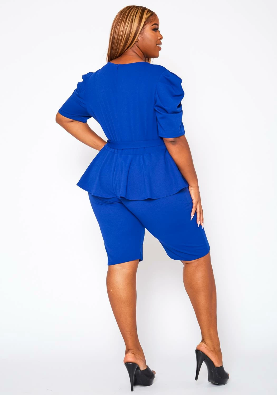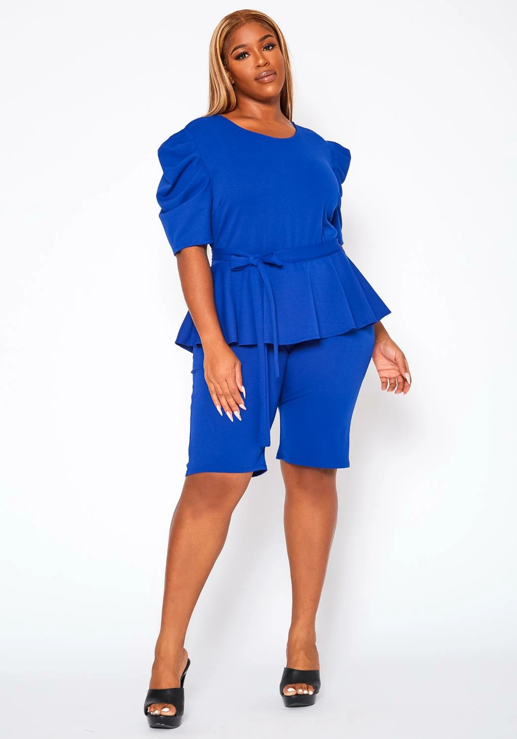 Looks like peplum top and biker shorts set? This is a romper for plus size women which features belted peplum ruffle.