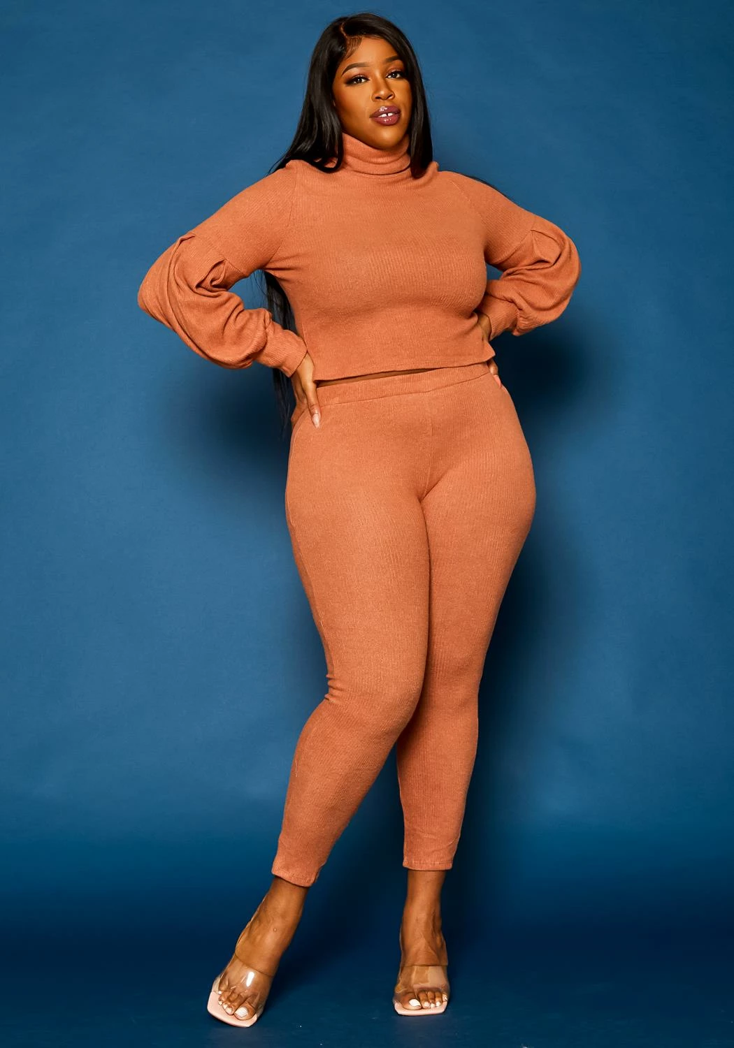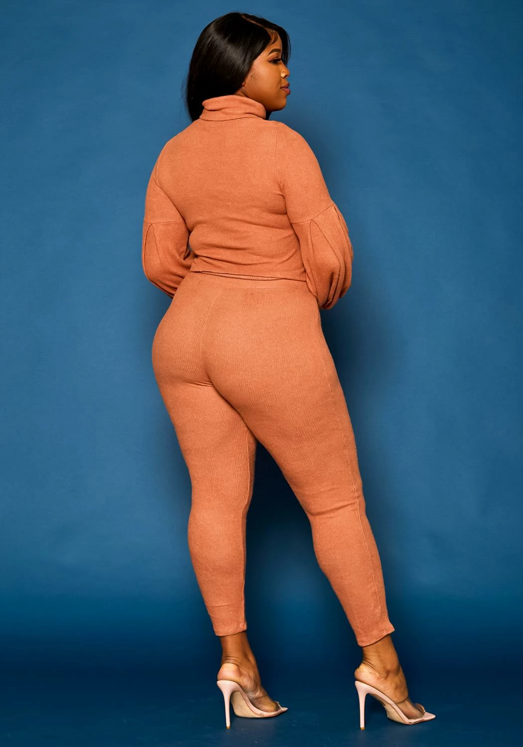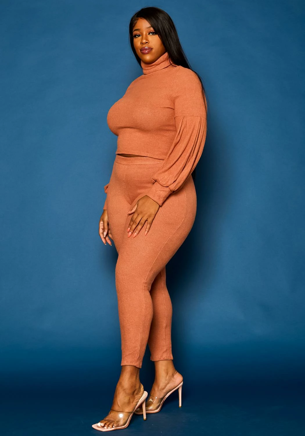 Plus size women’s matching set in ribbed knit material. Features a high neck long sleeve crop top and mid rise leggings.