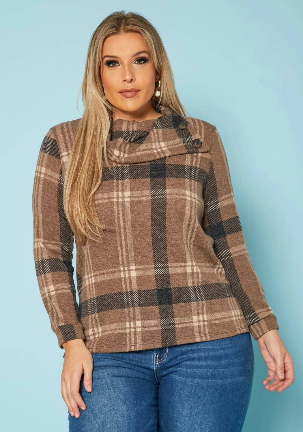 Cozy plus size women’s knit sweater in plaid print, asymmetric high neck style, fitted long sleeves and button hem.