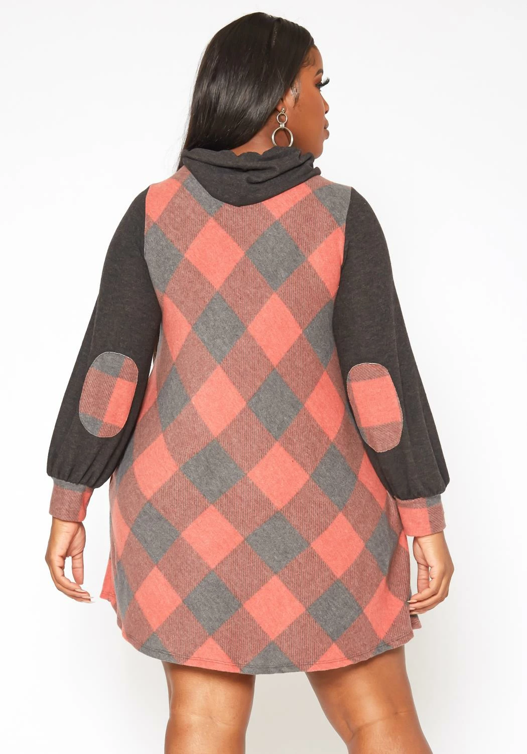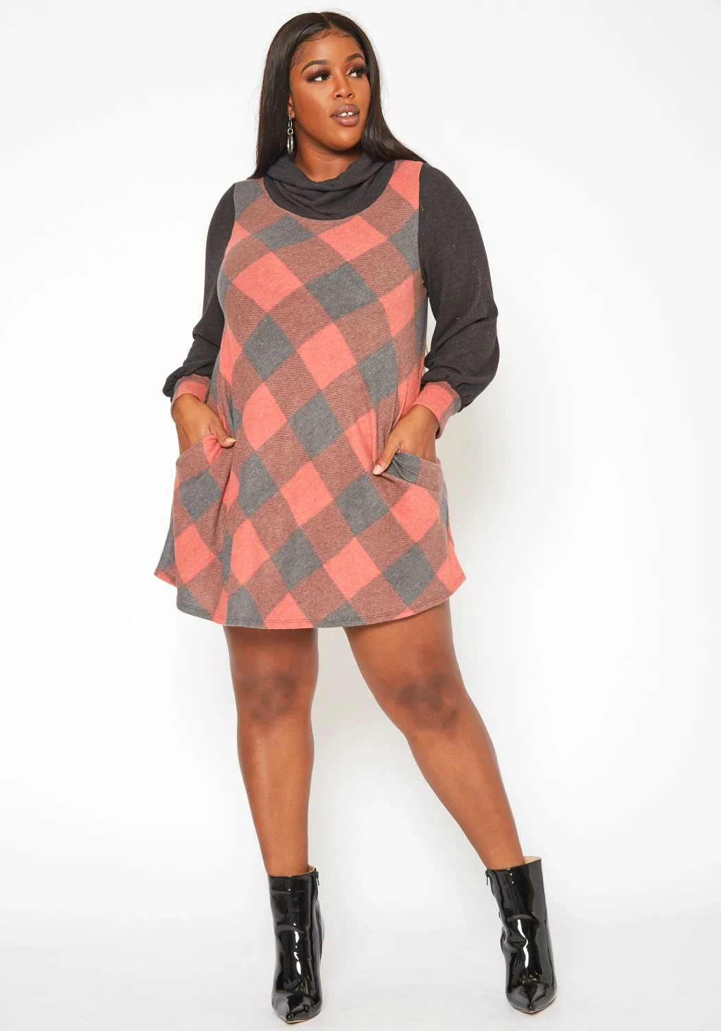Chic plus size women’s plaid pattern mini dress in fit to flare design, funnel neck style, loose long sleeves, fitted wrist cuffs and pocket hem.