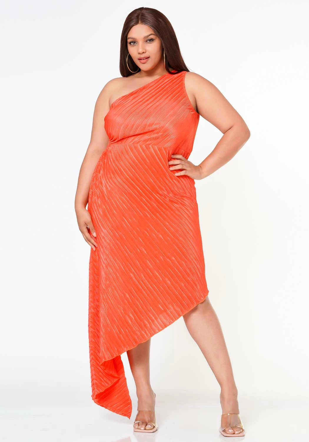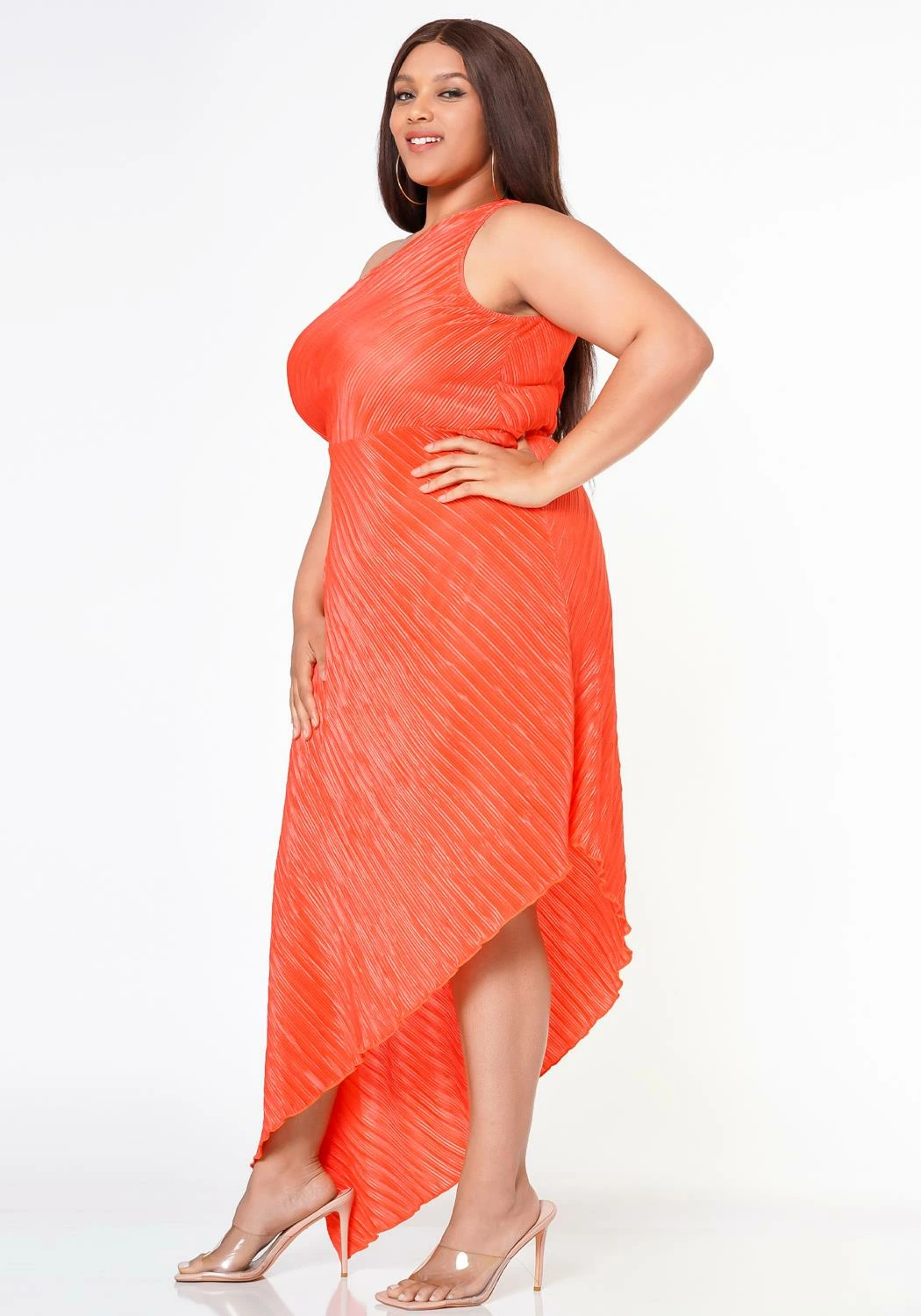 Mesmerizing asymmetric hem dress for plus size women which features a one sleeve design, pleated material and side keyhole cut out ascent.