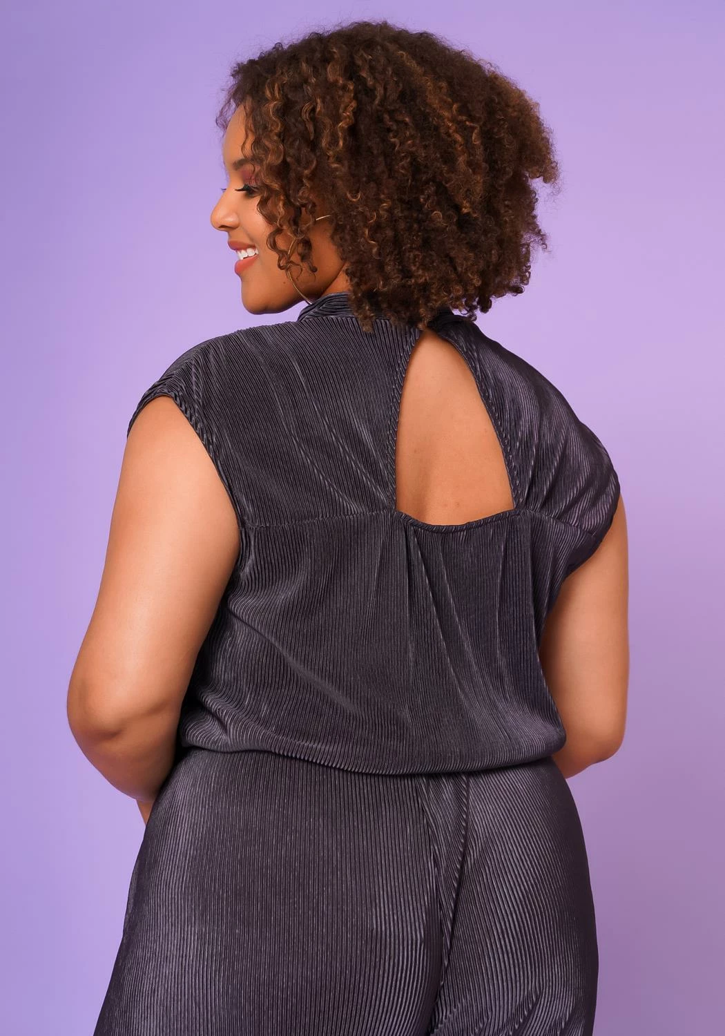 Fashionable plus size woman’s crewneck blouse in pleaded design, short sleeve style and waistband hem.