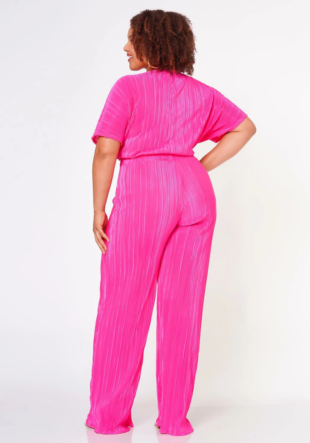 Beautiful plus size woman’s pleaded matching top and pants set 1/4 sleeve with front tie accent, and elastic pants waistband.