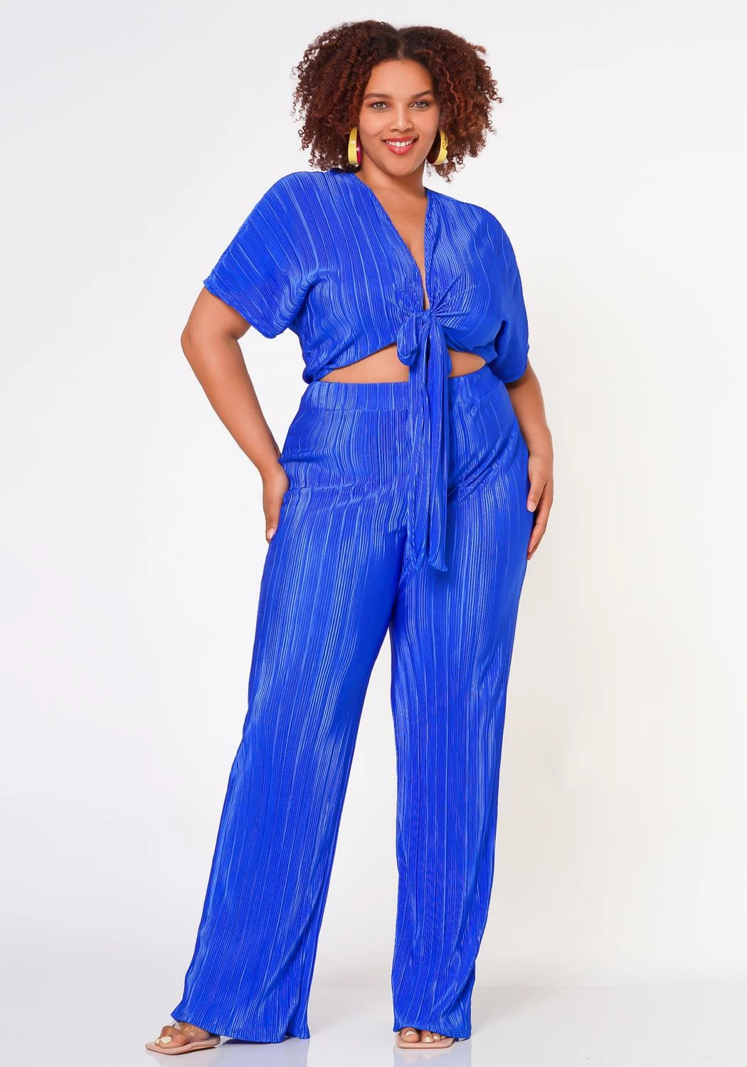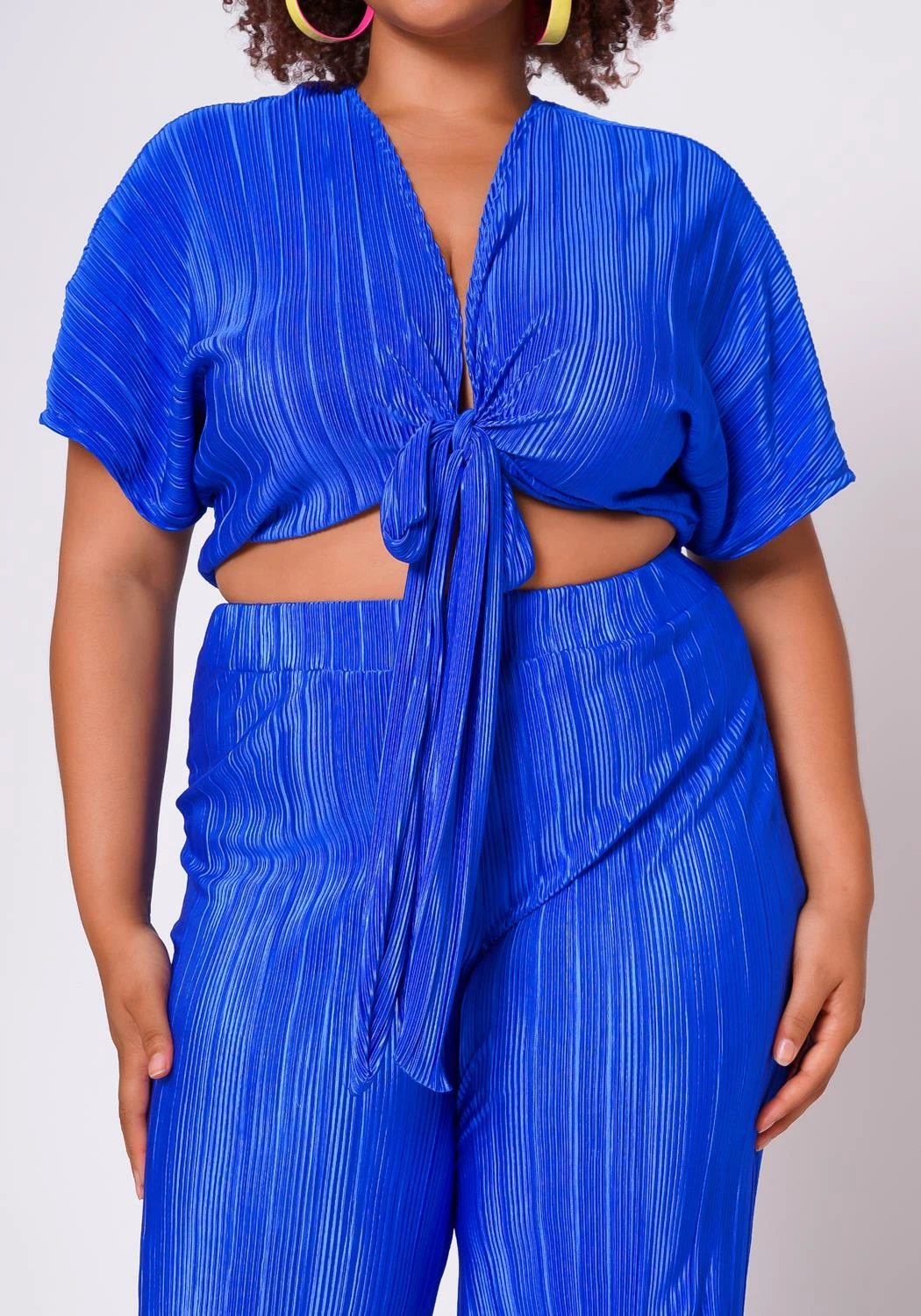 Beautiful plus size woman’s pleaded matching top and pants set 1/4 sleeve with front tie accent, and elastic pants waistband.