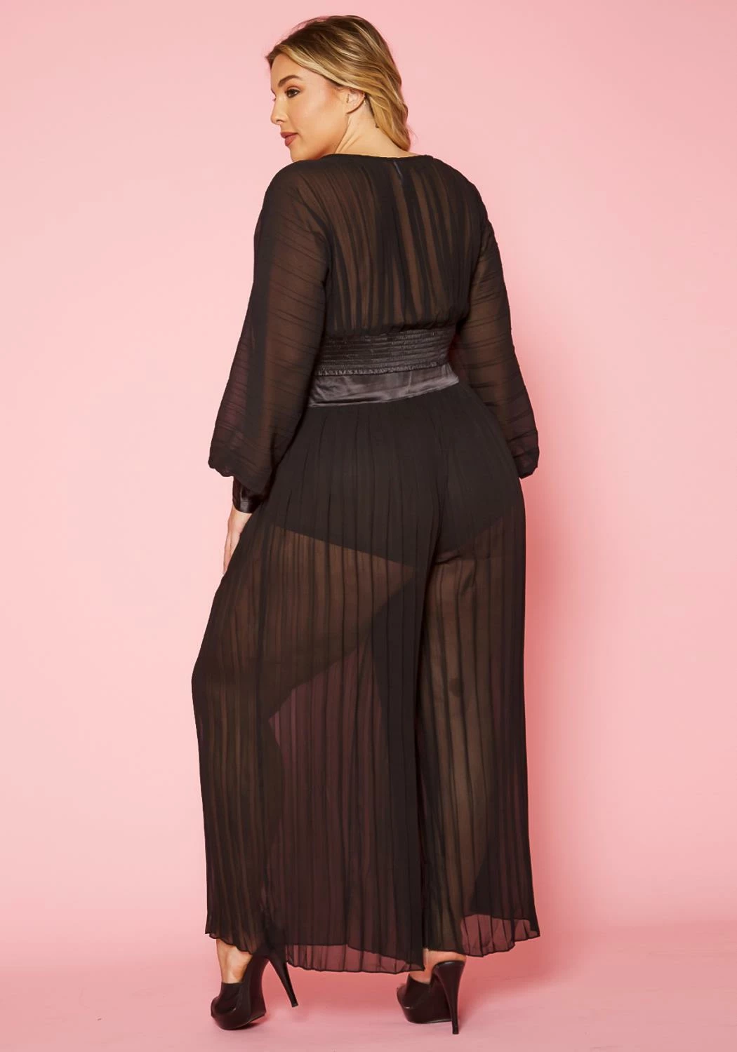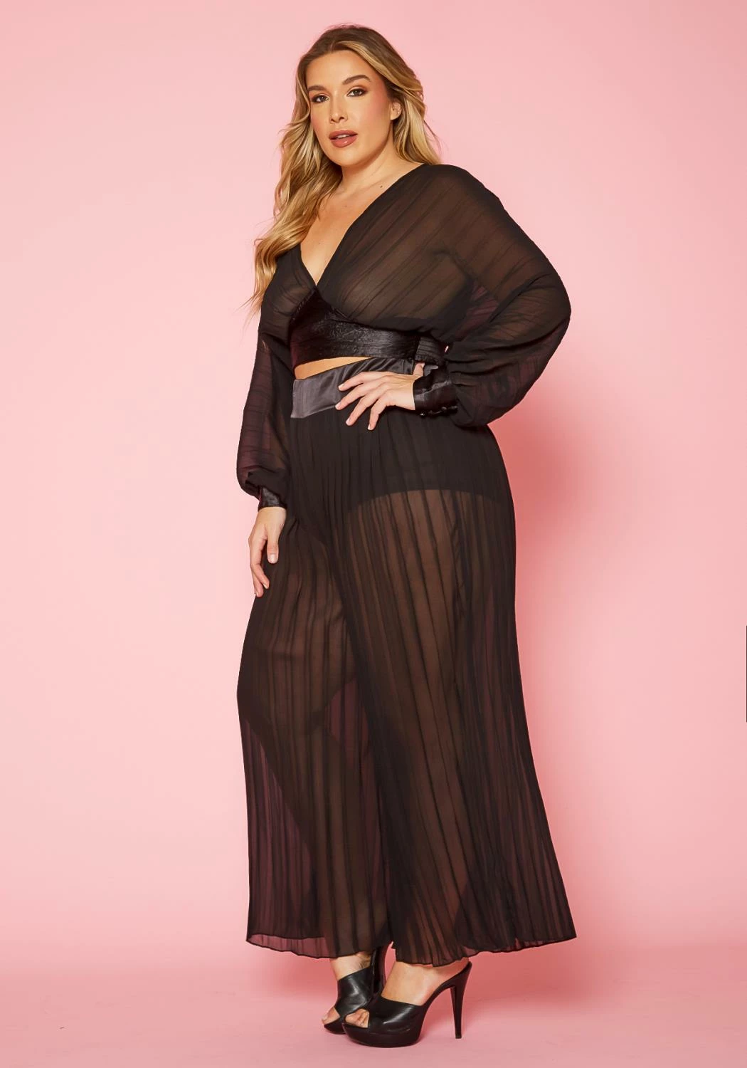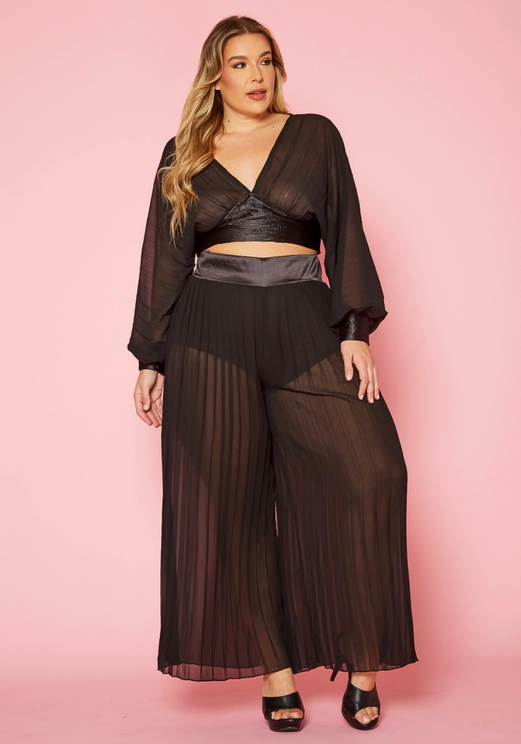 Gorgeous plus size women’s matching sheer pleated set. Features a v-neck style, dolman long sleeve top and high waist flare palazzo pants.