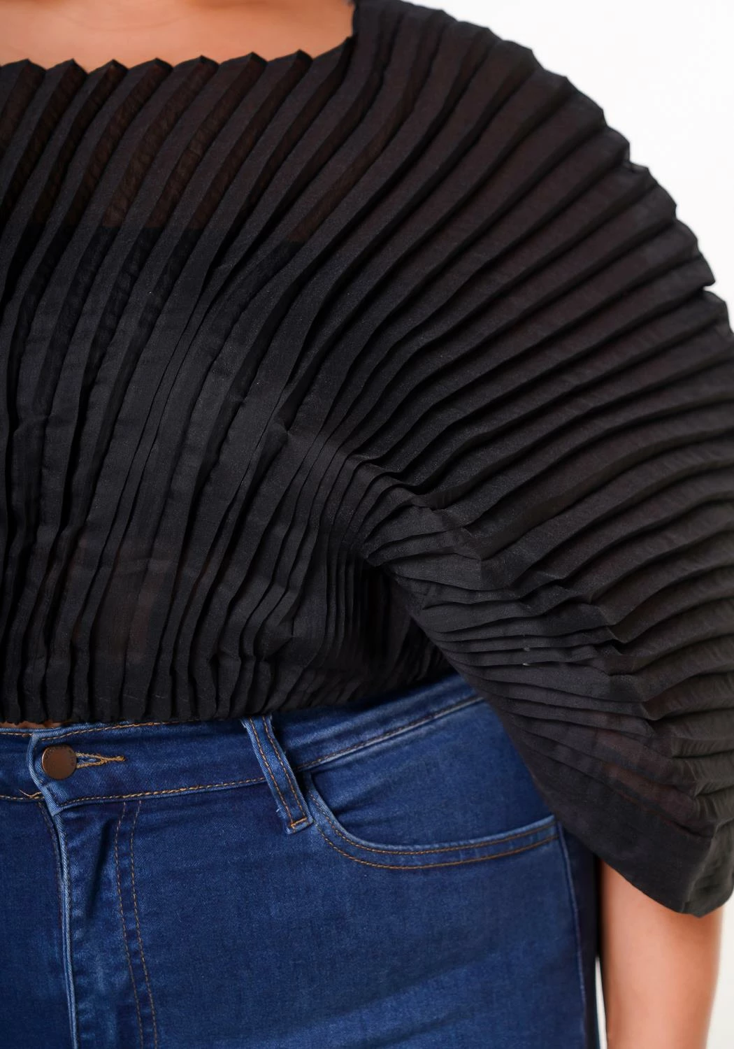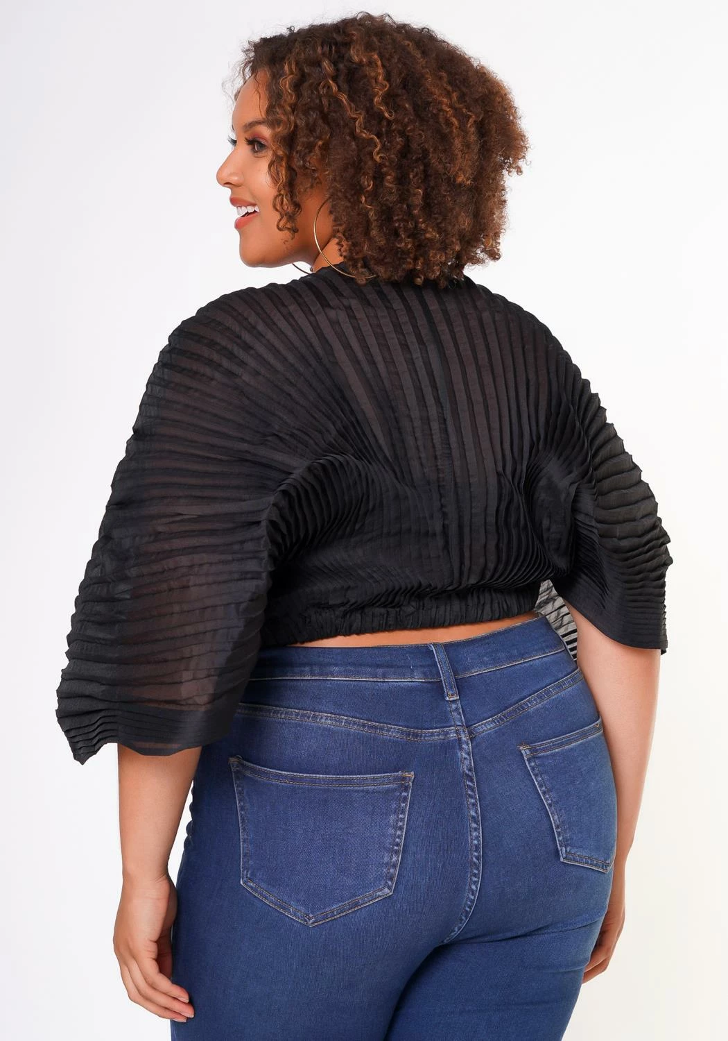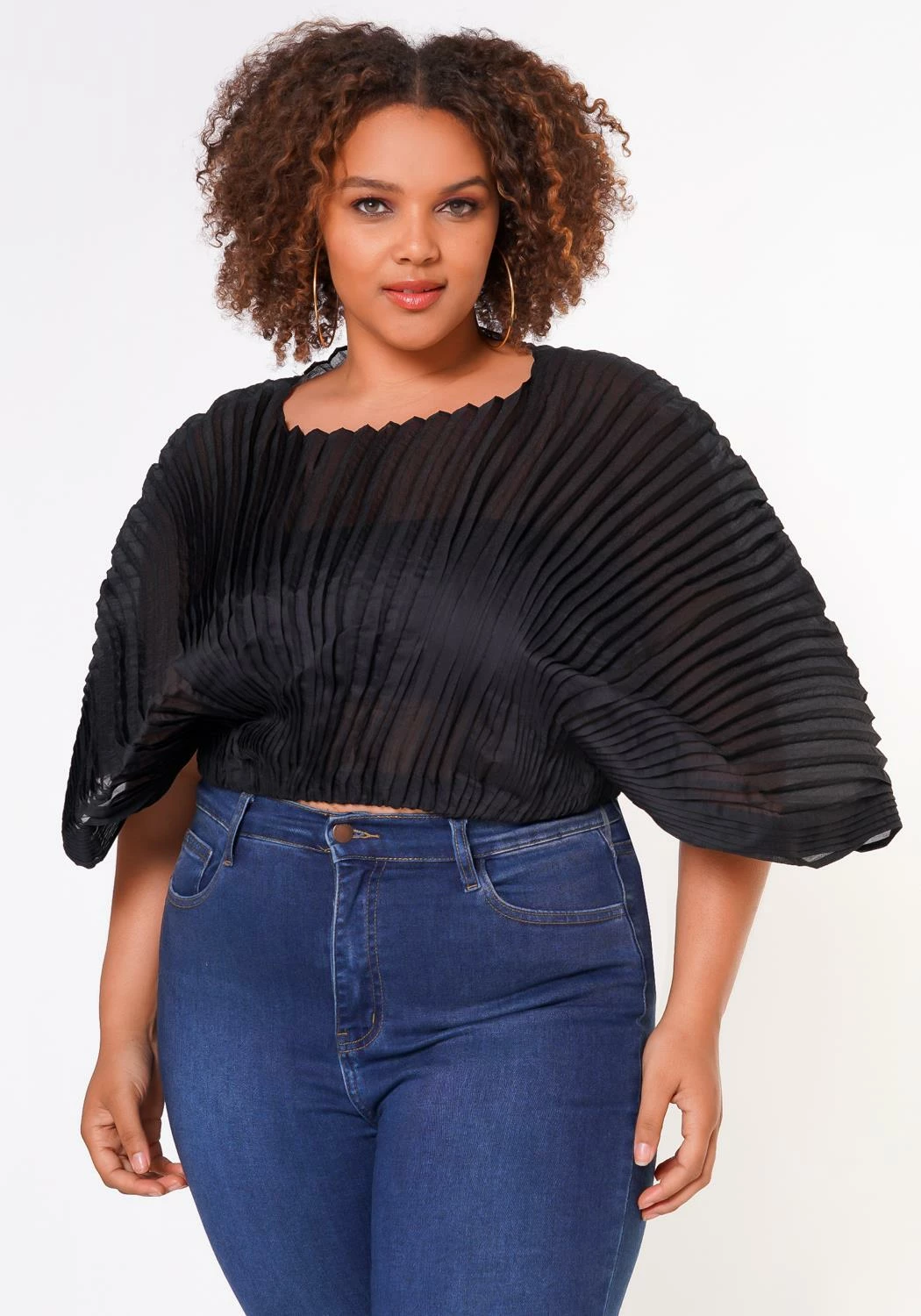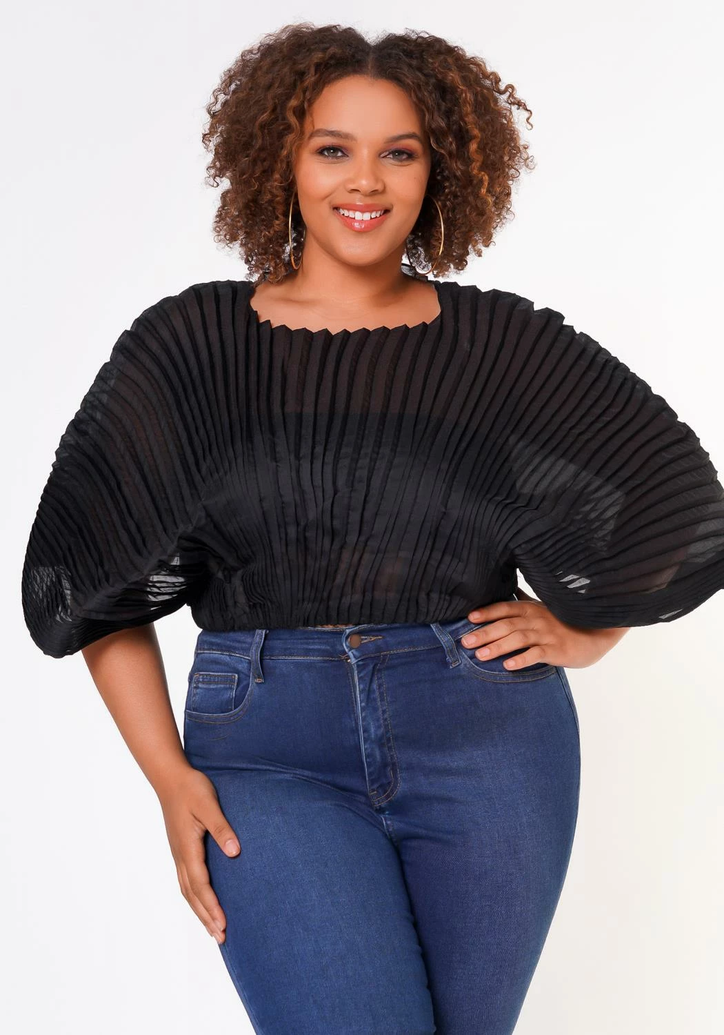 Stylish plus size woman’s dolman top with a round neckline 3/4 sleeves and ruched detail.