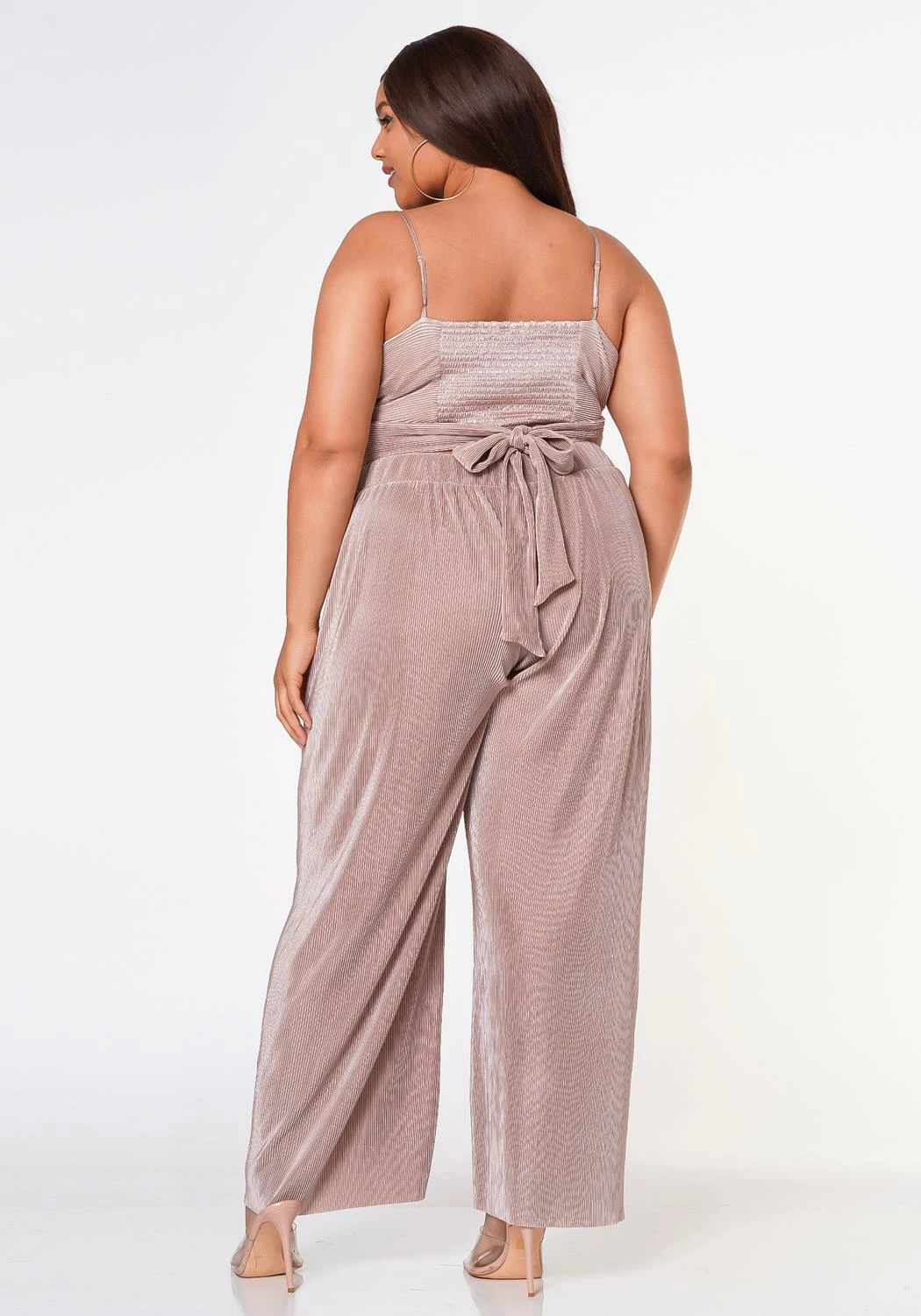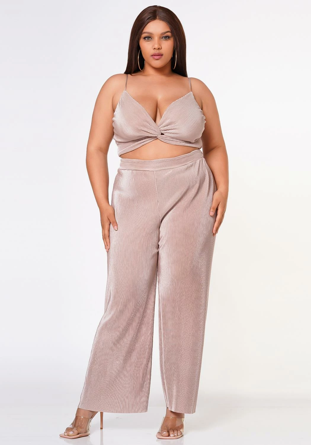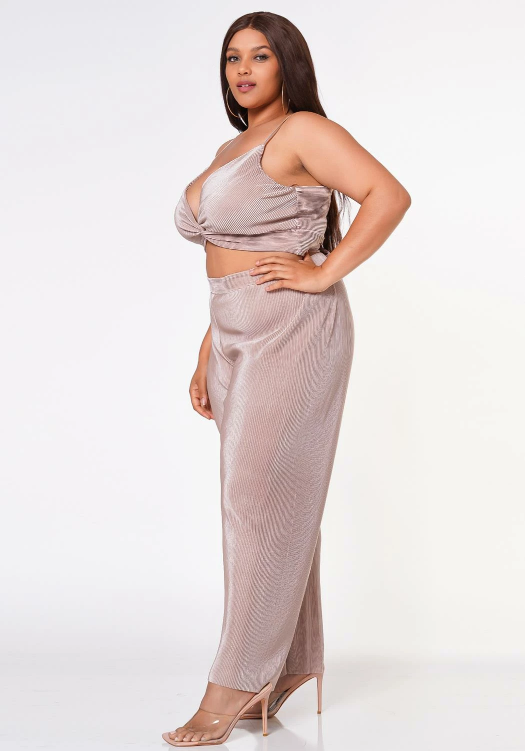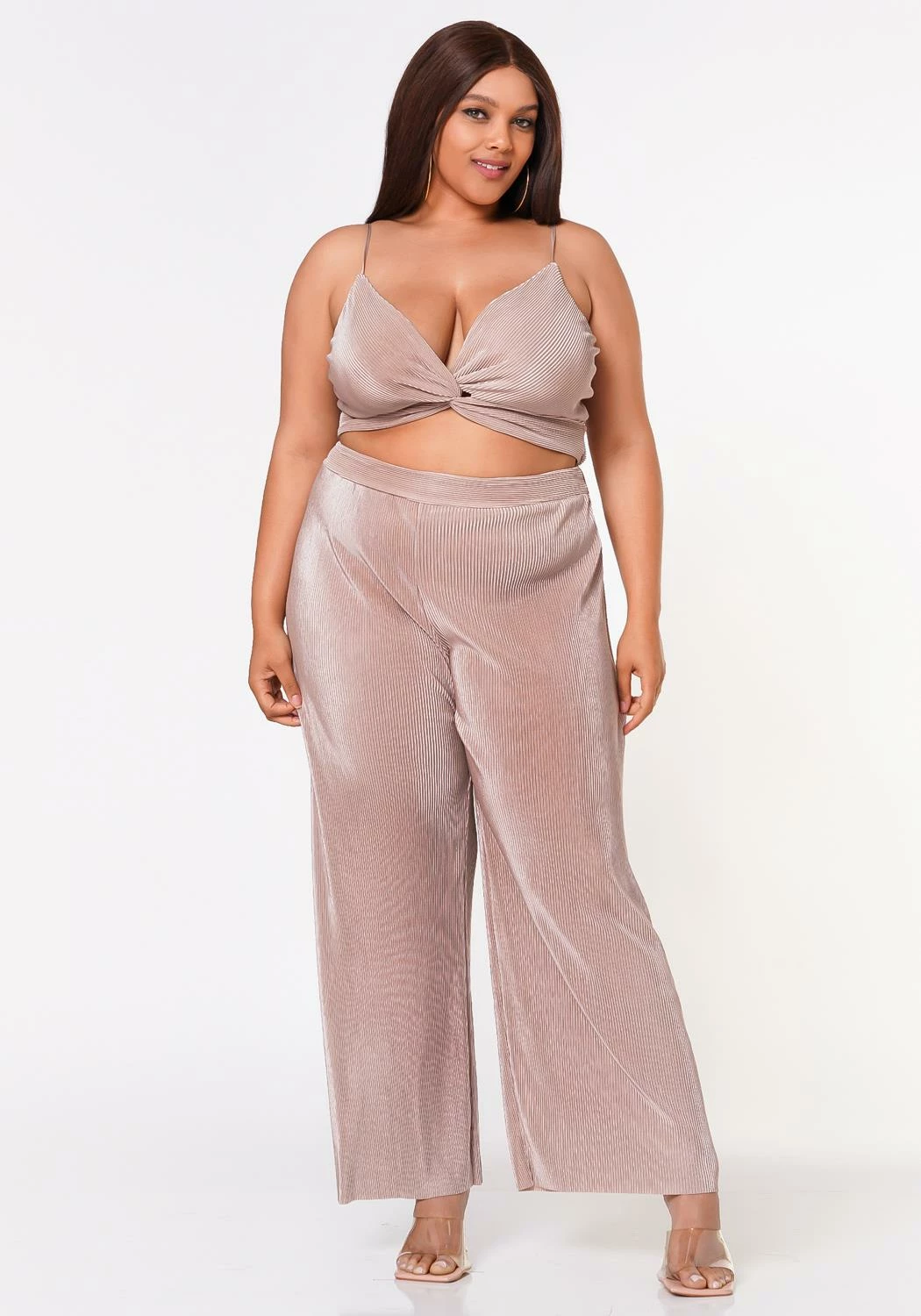 GNO matching set in reflective pleated material. Features a twist hem cami top with adjustable shoulder straps and high waist straight leg pants.