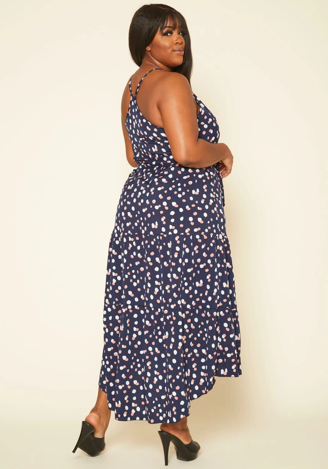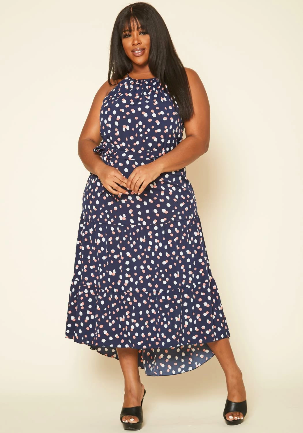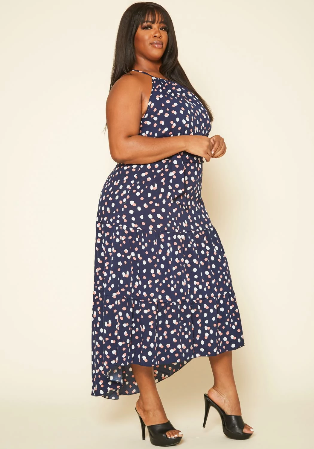Plus size women’s maxi dress in polka dot print, flare design and waist tie ascent.