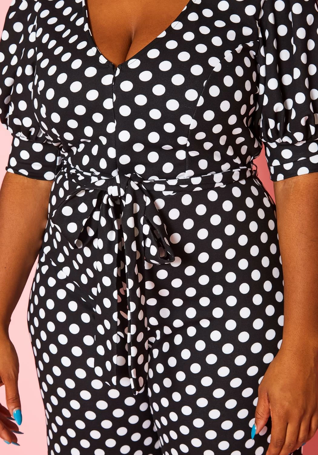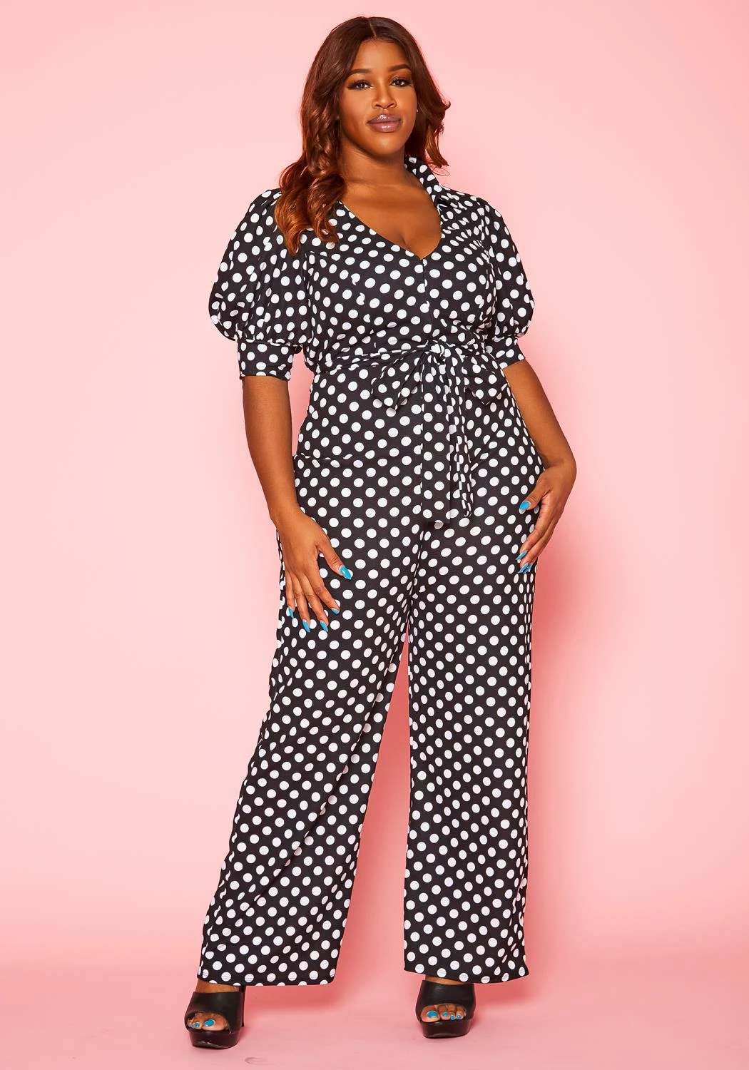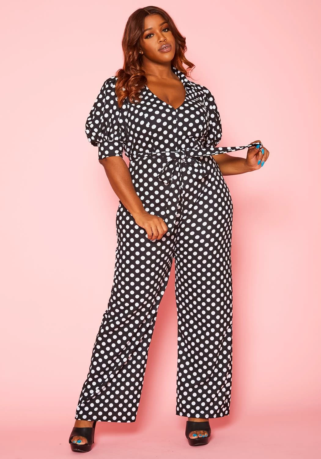 Chic plus size women’s jumpsuit in polka dot print, v-neck style, short puffy sleeves, waist tie ascent and flare leg hem.
