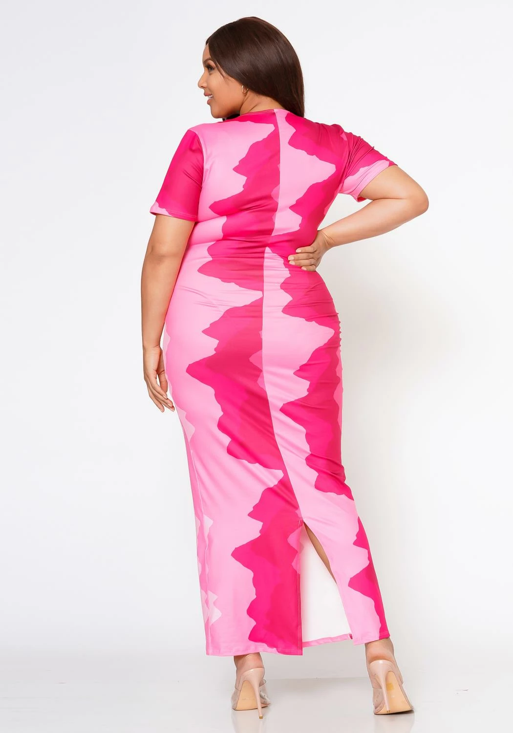 Simply gorgeous plus size women’s casual maxi dress with pink abstract pattern, v-neckline and short sleeves.