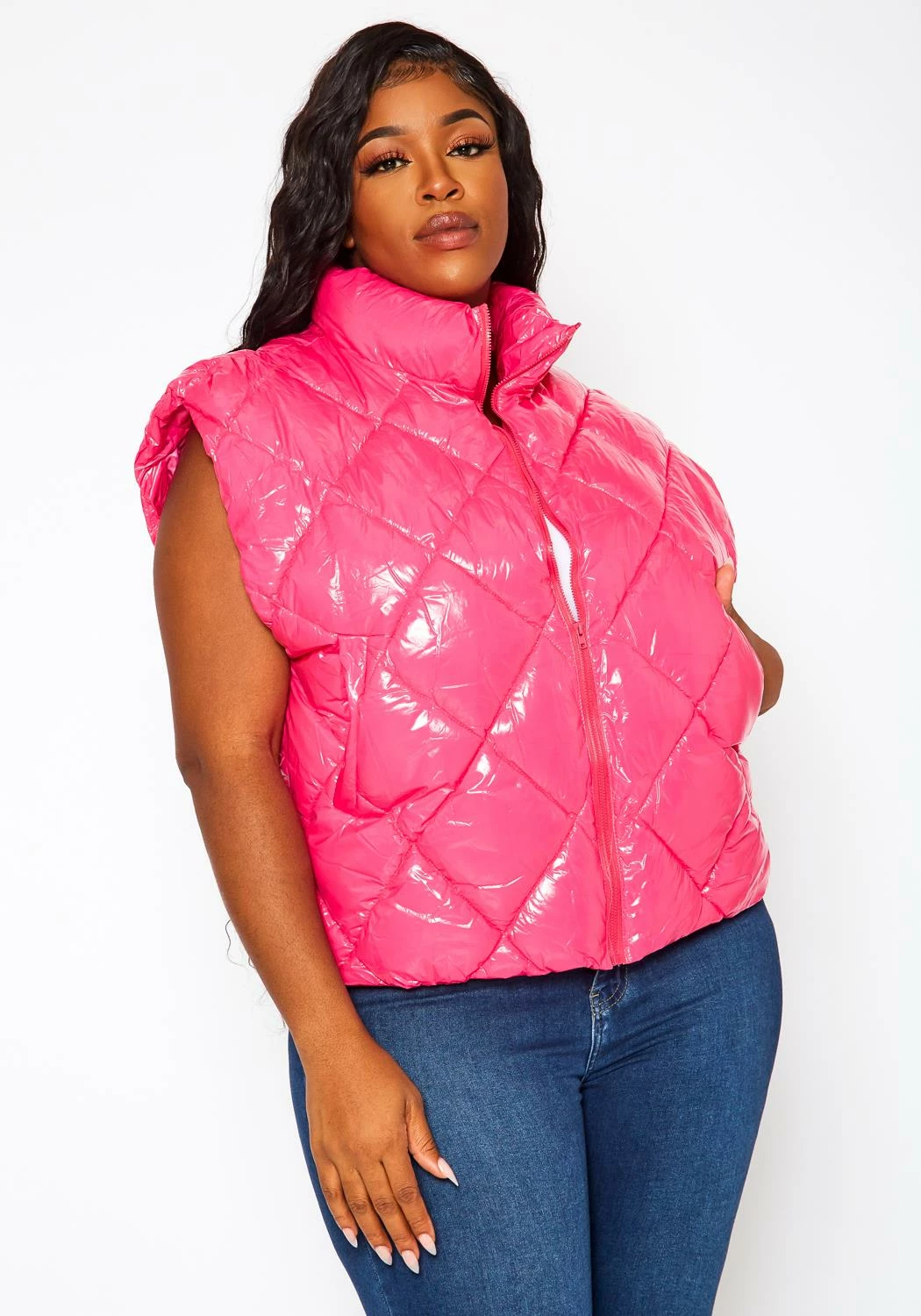 Trending plus size women’s puffer vest in PU faux leather, quilted hem, zipper front, cuffed wrists and high neck design.