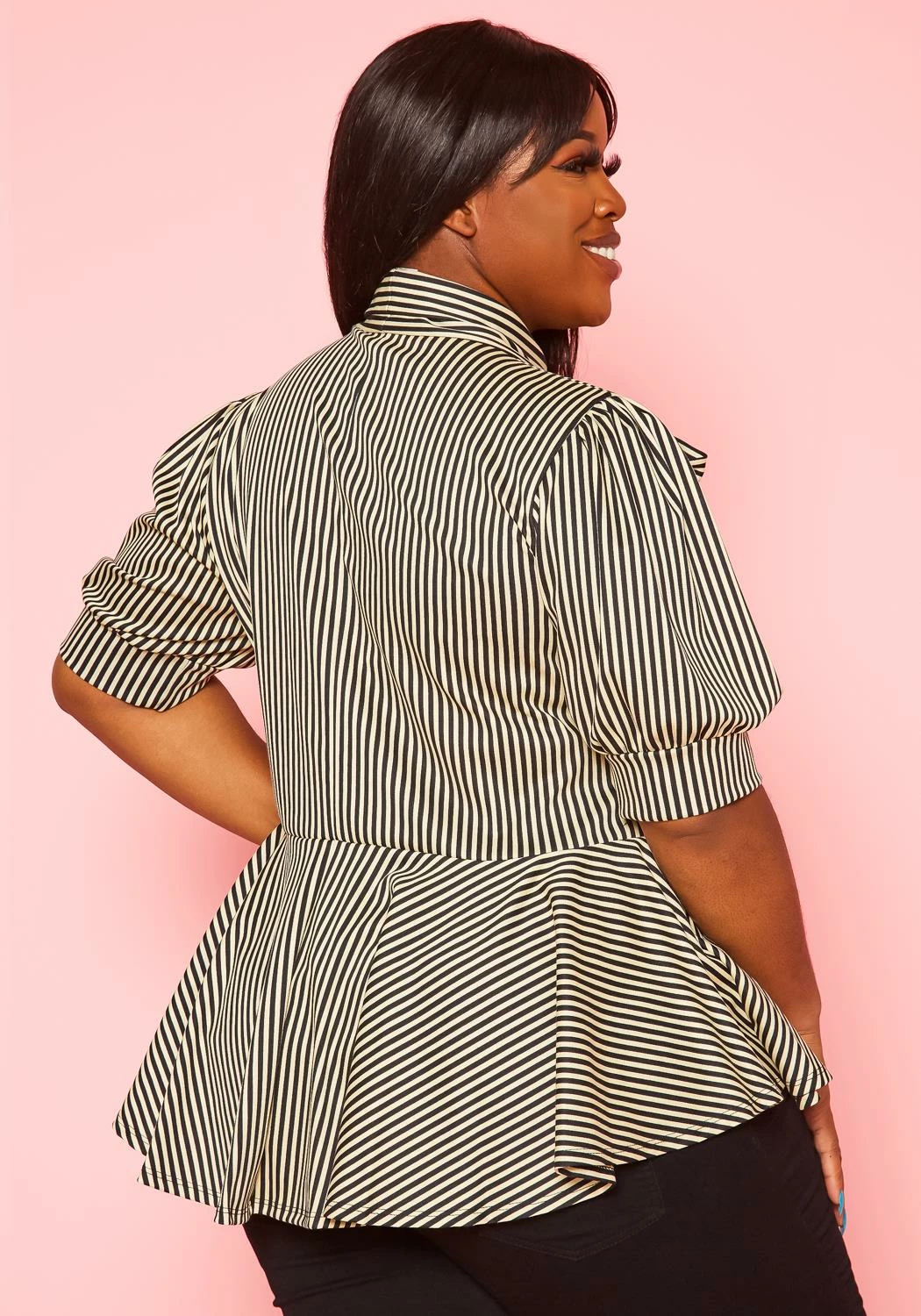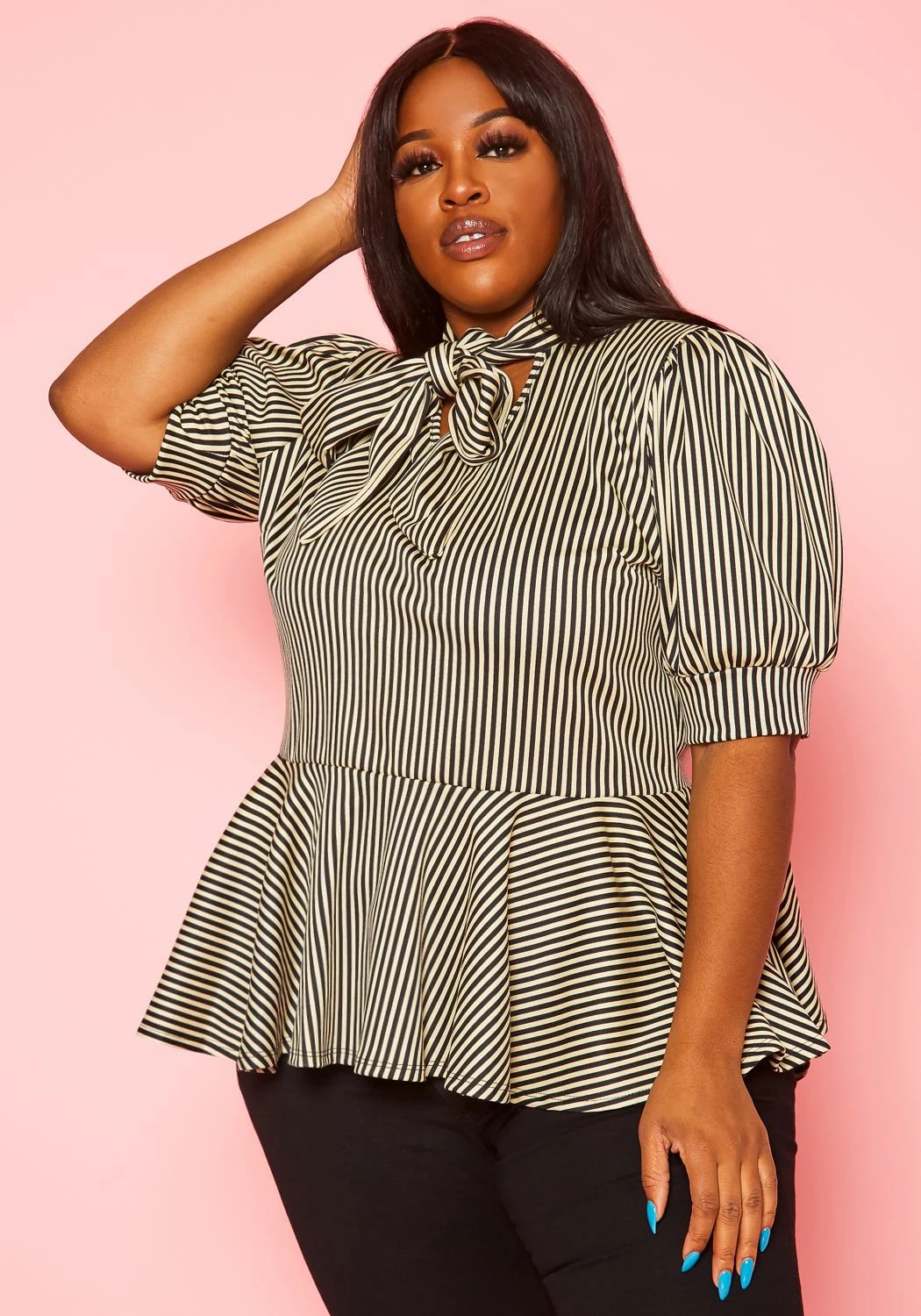Plus size women’s peplum top in multi striped print, collar tie ascent, puff shoulder short sleeve and cinched waist.