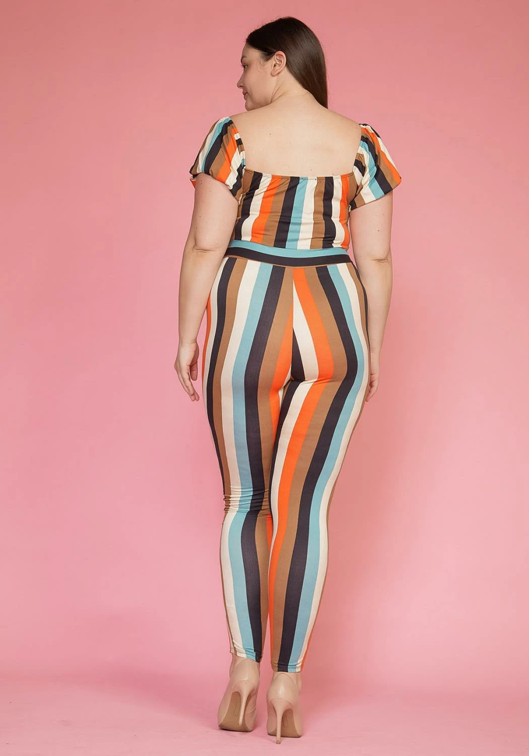 Plus size women’s multi striped jumpsuit in off shoulder style, puffy short sleeve and wired v-slit hem.