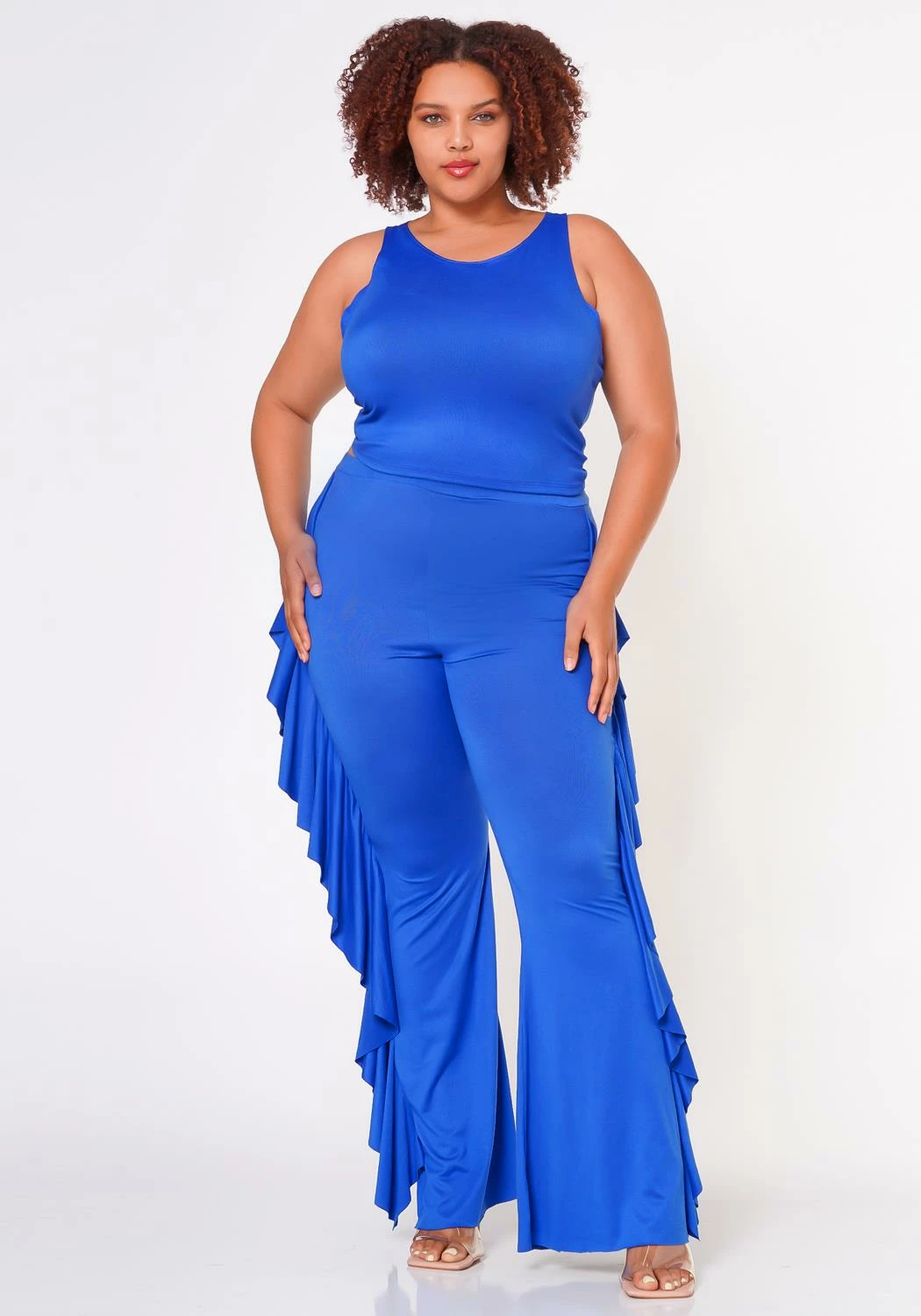 Must have summer matching set which features a racerback fitted top and matching flare leg pants with waterfall ruffle trim design.