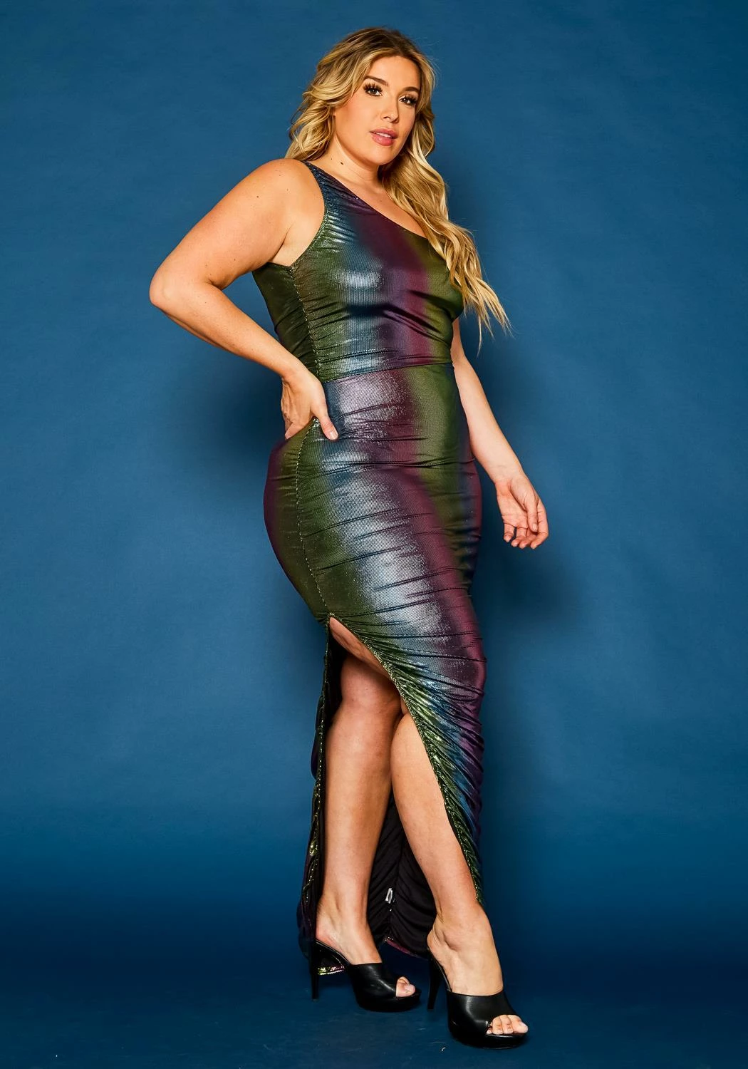 Stunning rainbow chrome maxi dress in bodycon fit, one sleeve design and ruched details.