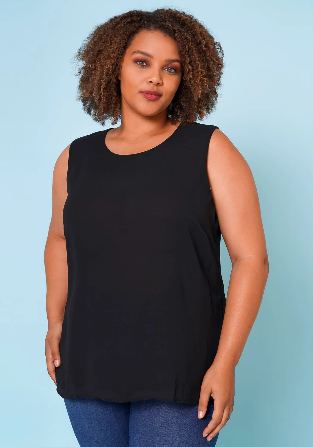 Plus size woman’s simple relaxed fitted sleeveless shirt with back button detail.