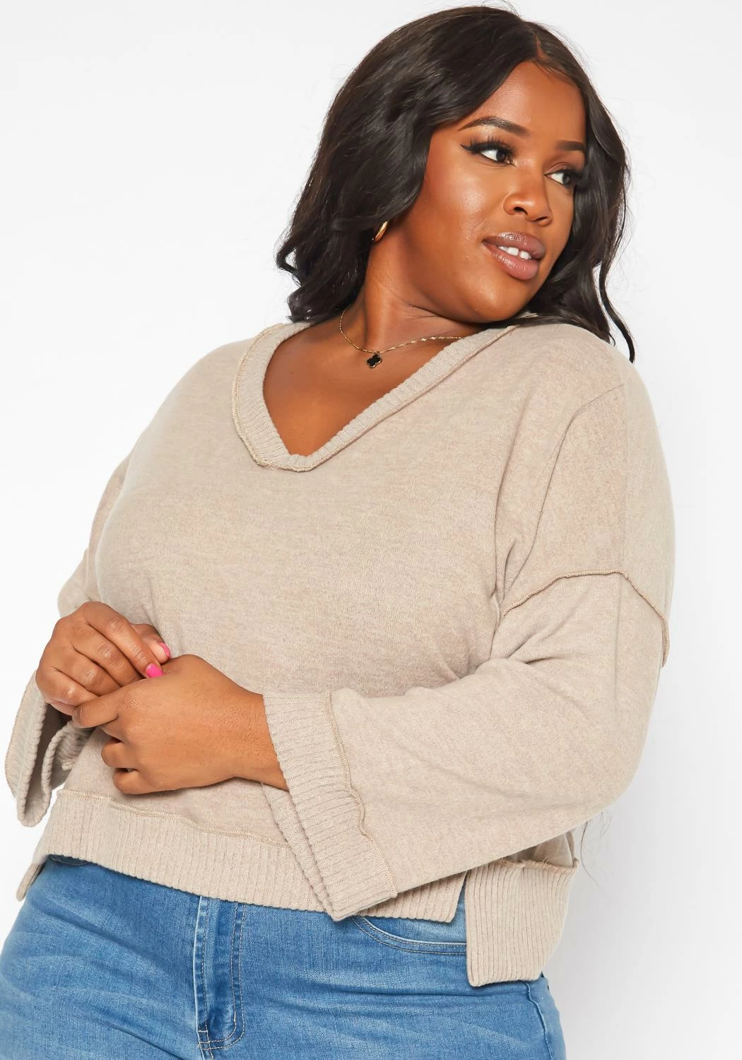 Casual plus size women’s sweater in v-neck style, relaxed fit and loose long sleeves.