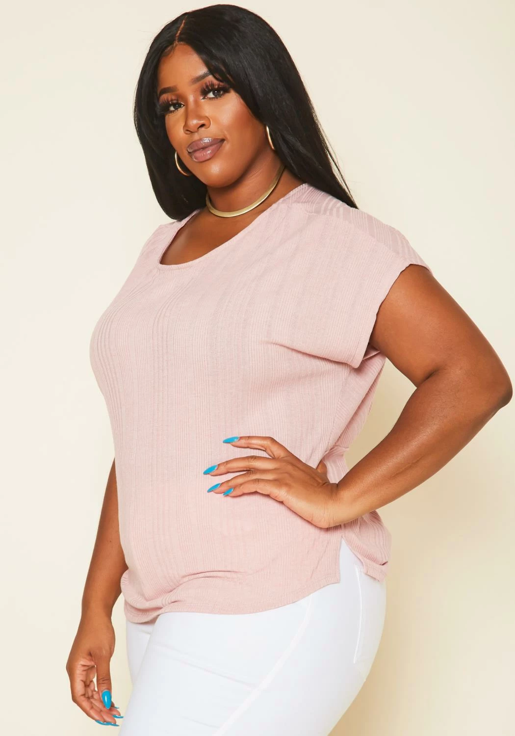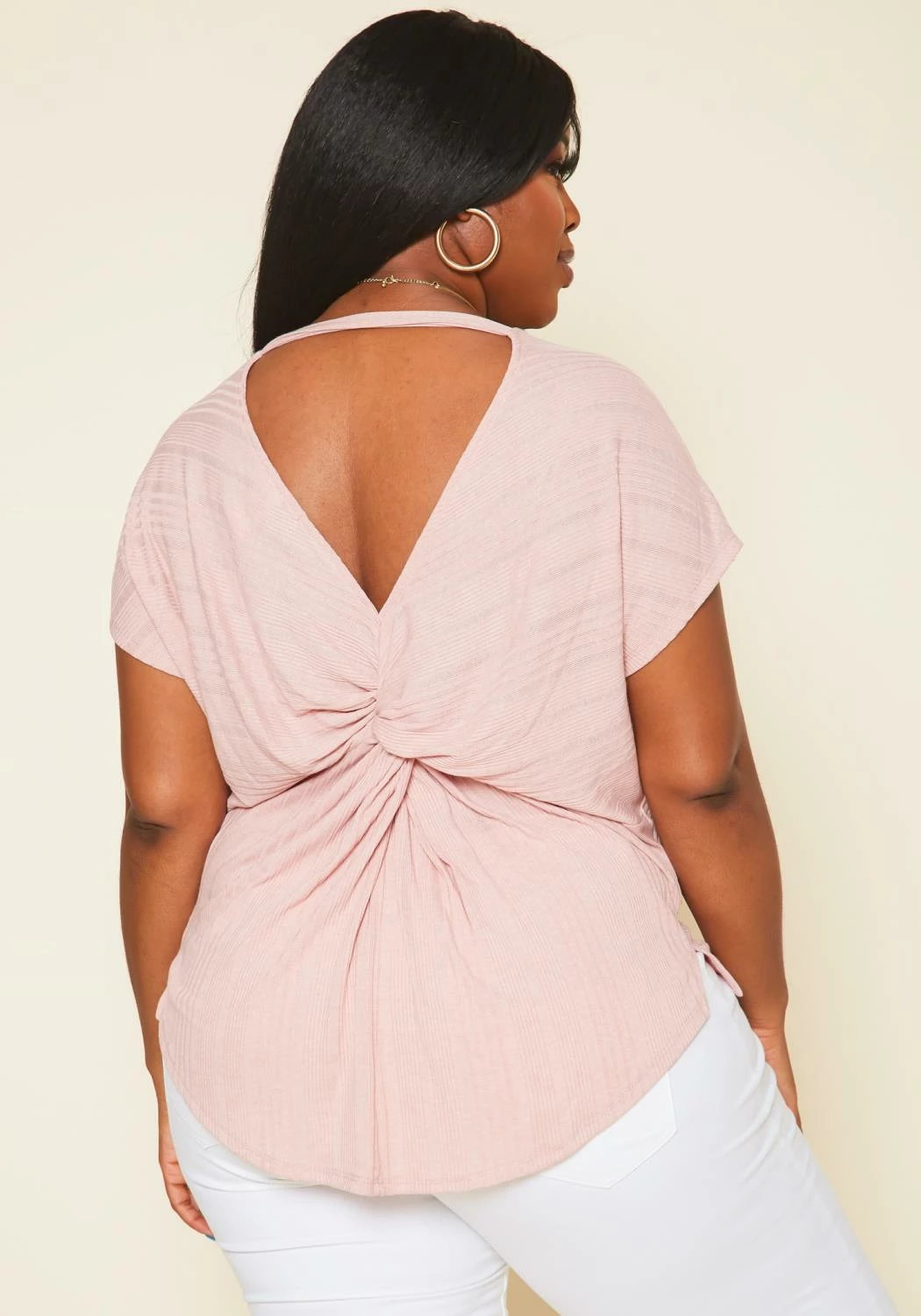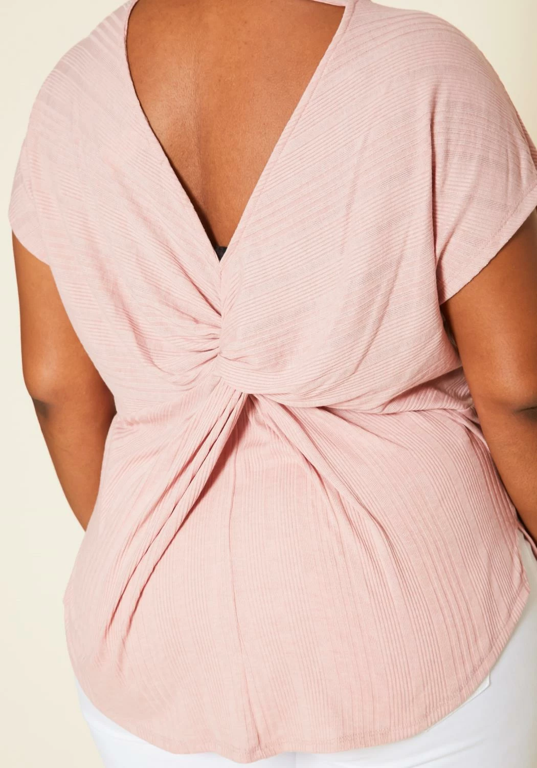 Casual plus size women’s top with ribbed material, round neck style, dolman short sleeves and back twist hem design.