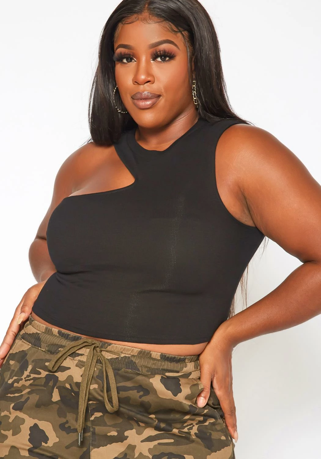 Versatile plus size women’s must have top in ribbed knit material, crew neck style and asymmetric one sleeve design.