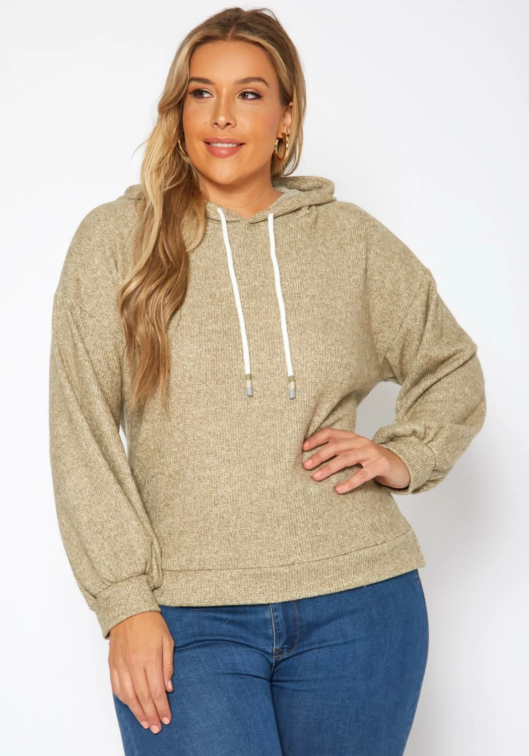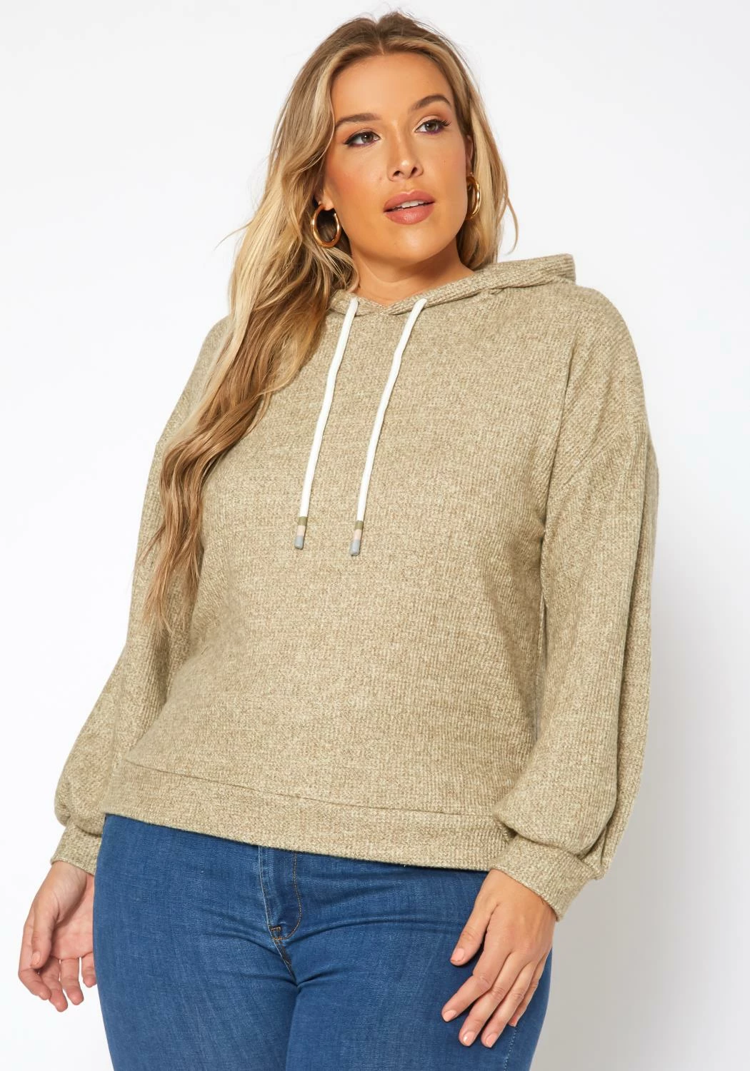 Cozy casual plus size women’s hooded sweater in ribbed knit material, hooded design with drawstring hem and fitted wrist cuffs.