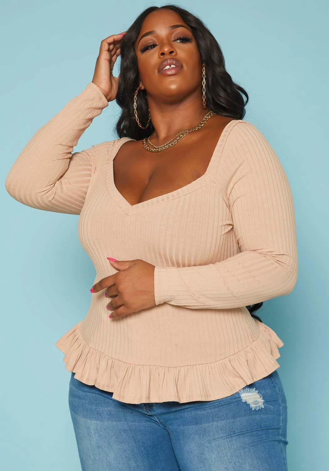 Lovely plus size women’s shirt in ribbed knit material, sweetheart neckline, fitted long sleeves and ruffle flare hem.