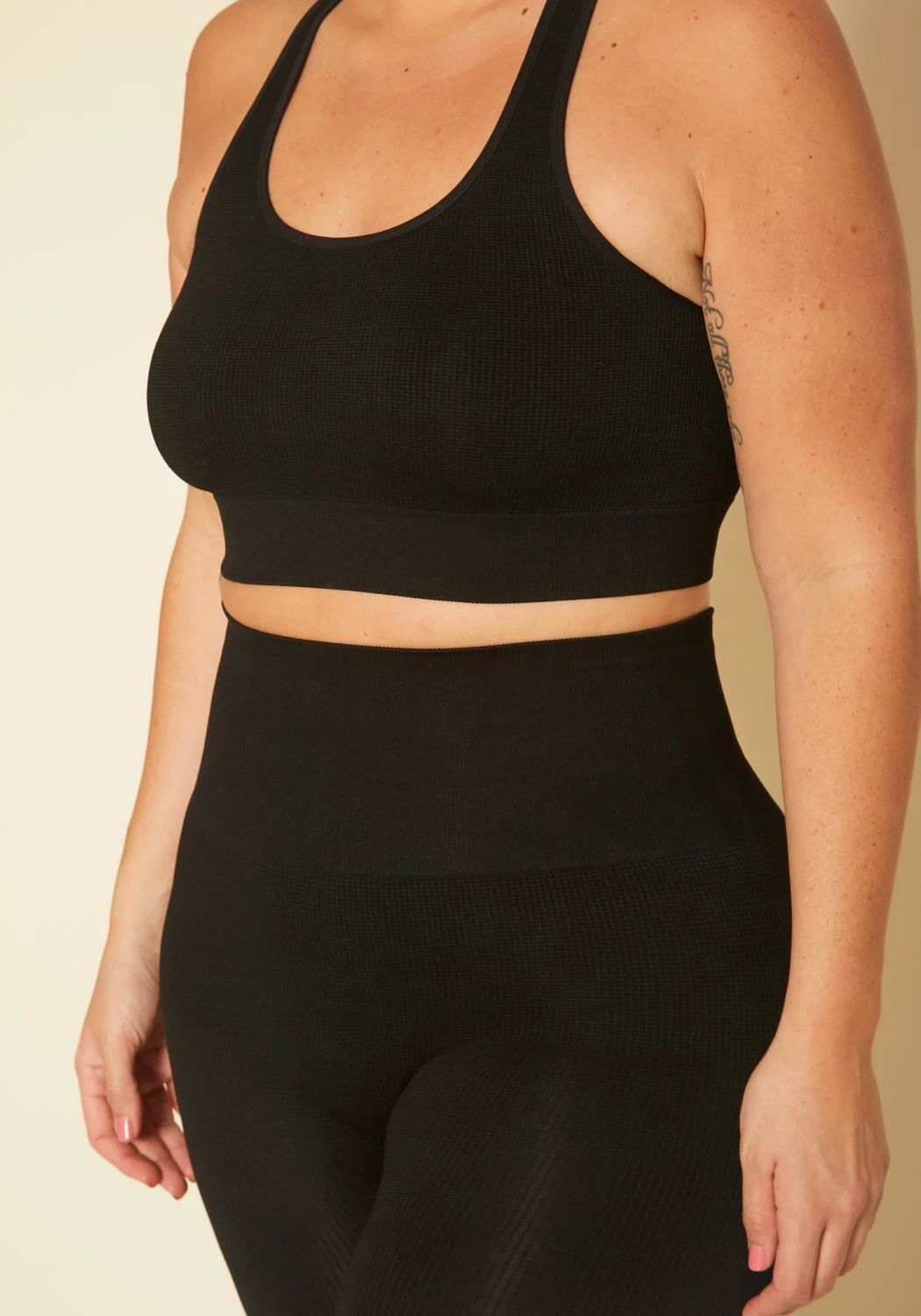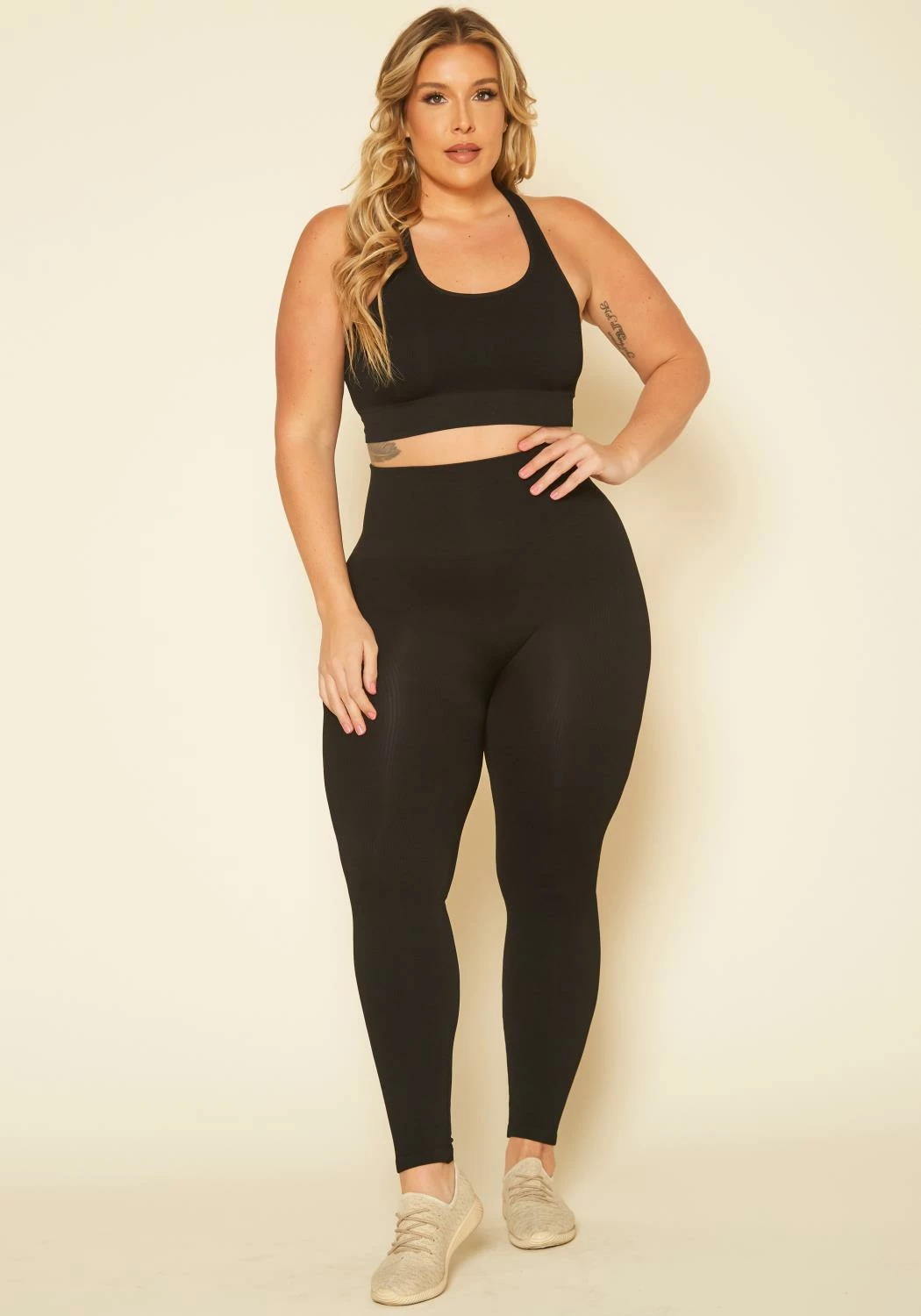 Comfy plus size women’s matching ribbed set which features a scoop neck racerback tank crop top and high waist leggings.
