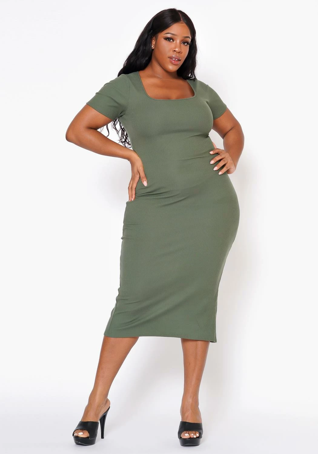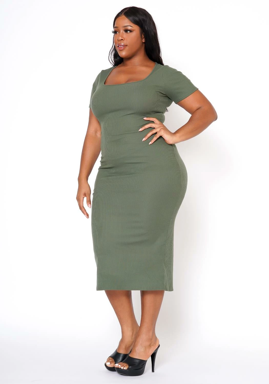 Must have basic plus size women’s midi dress in ribbed material, square neckline, short sleeves and back split hem.