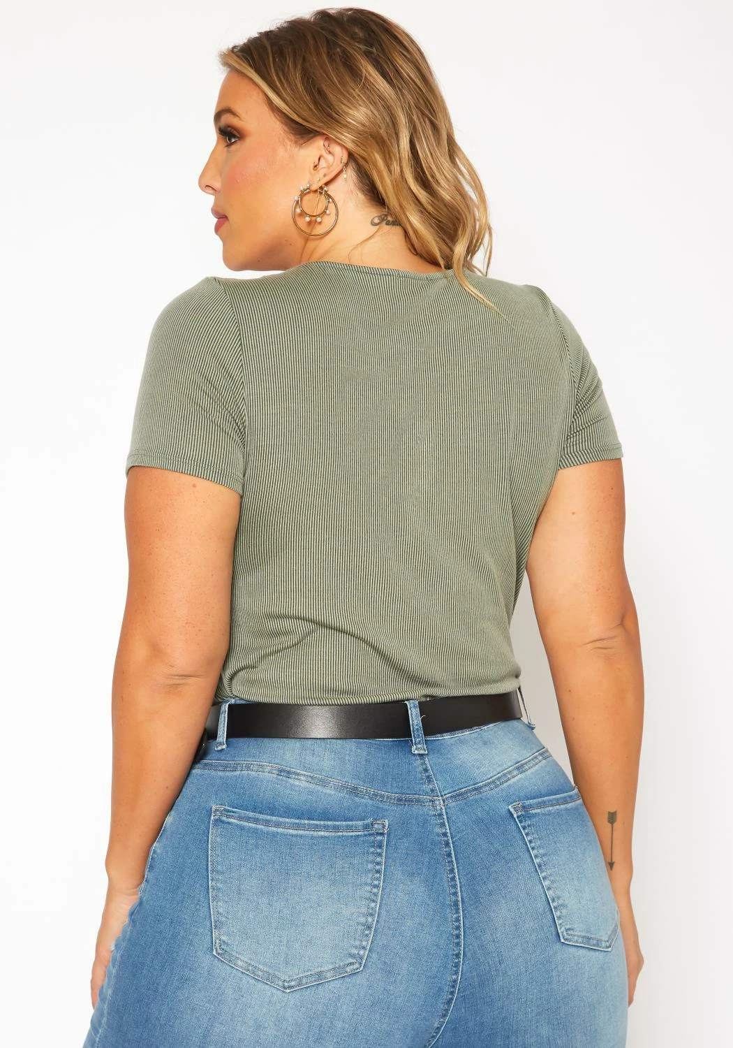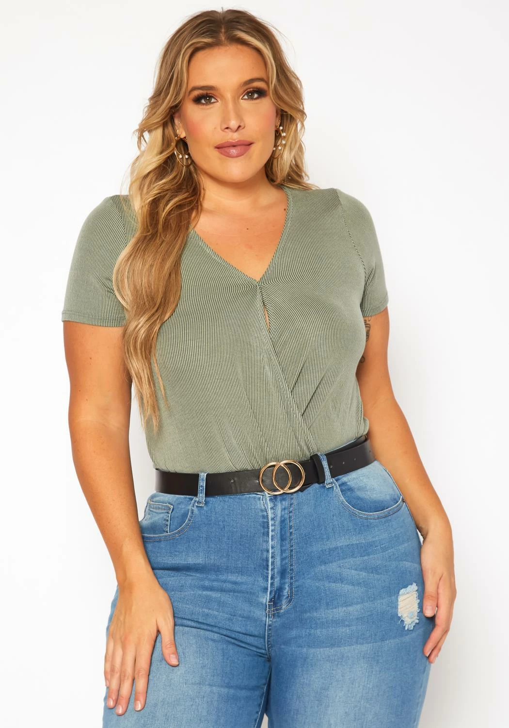 Must have plus size women’s bodysuit in ribbed material, v-neck style, short sleeves, wrap overlay design and snap button closure.